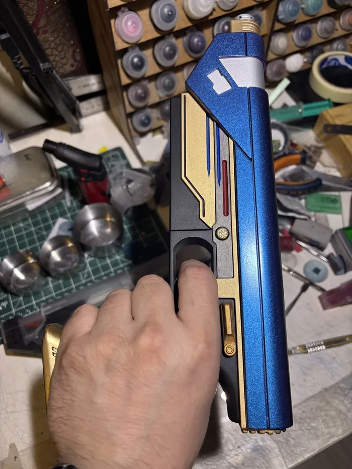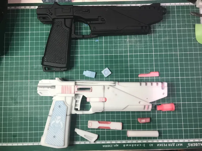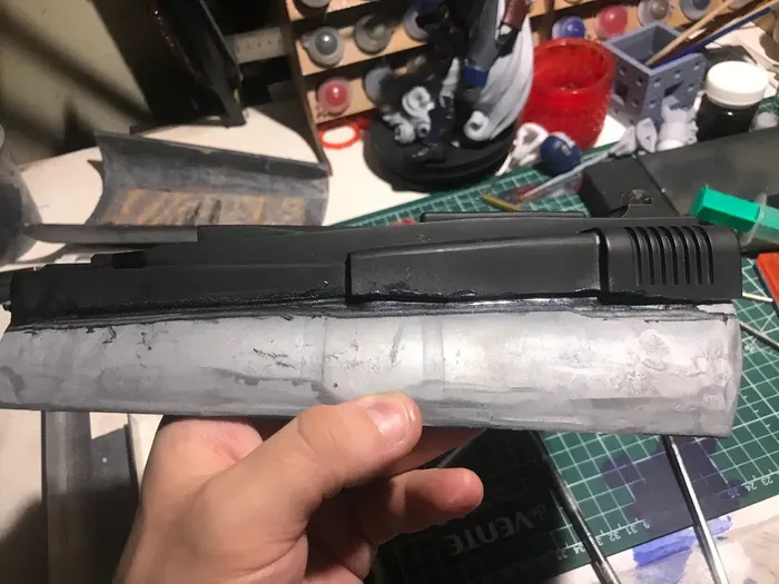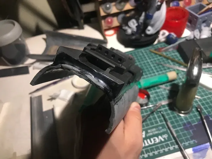 Удивительно, но практически все отлично встает на свои места! если бы с вестаром было бы также! так как без сложностей не интересно, то спусковой крючок, кнопка и переключатель должны быть подвижными. да, хотелось еще сделать место под установку энергоячейки, но это на когда нибудь потом, не охота настолько заморачиваться. Оптика пока отложена на неопределенный срок - тк использовать деталь от "собери телескоп" я не хочу, покупать монокуляр или какую нибудь страйкбольную пока жаба душит, поэтому сверху пока будет плашка, скрывающая пазы для крепления оптики и прочего. Теперь нужно все склеить, залить внутрь эпоксидку, ведь не забываем мудрость "Тяжесть — это хорошо. Тяжесть — это надежно. Даже если не выстрелит, таким всегда можно дать по голове.", да и бонус к крепости самой модели. на этом этапе были сложности, но связанные с внешними причинами в виде рыжего шерстяного чудища. Шлифуем, и красим, покрываем лаком