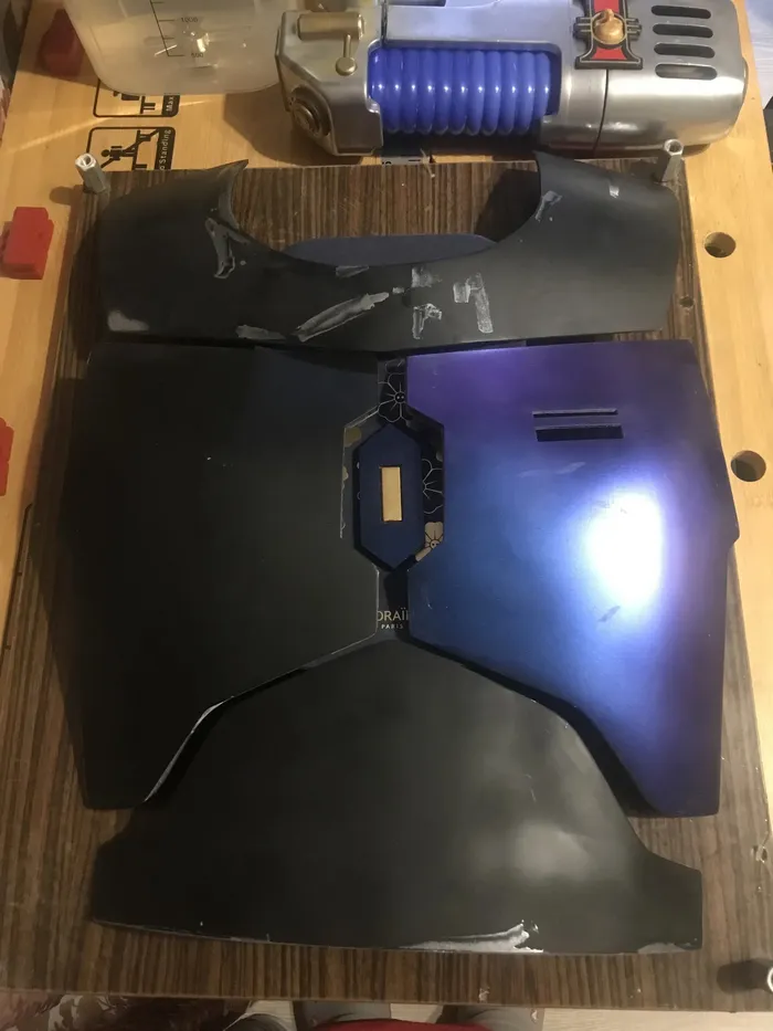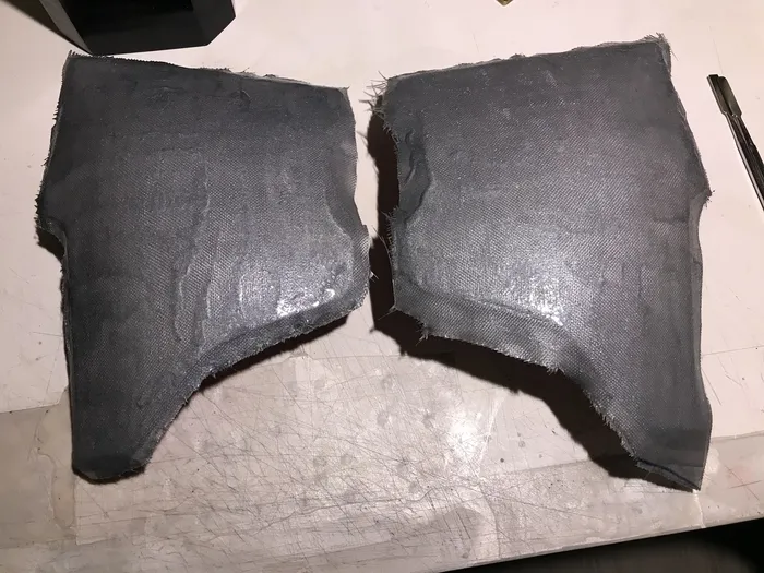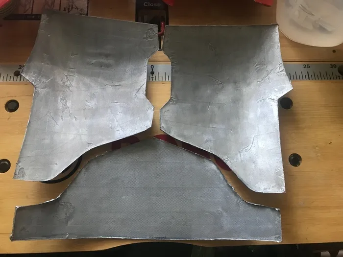 Итак, я начал делать новый. Никакой стальной проволоки - только эпоксидка, 2 слоя арамида (остался с пары других "проектов") и стеклоткань (сейчас я то понимаю, что тогда пожадничал и надо было больше слоев стеклоткани и меньше чистой смолы, но не суть). Я взял распечатки, пропитал их смолой, верхнюю часть также сразу укрепил малярной сеткой (стоб сделать хоть небольшой слой смолы под стеклотканью и начал собирать их по отдельности (а выше упомянутые детали помогали не налажать с размерами)