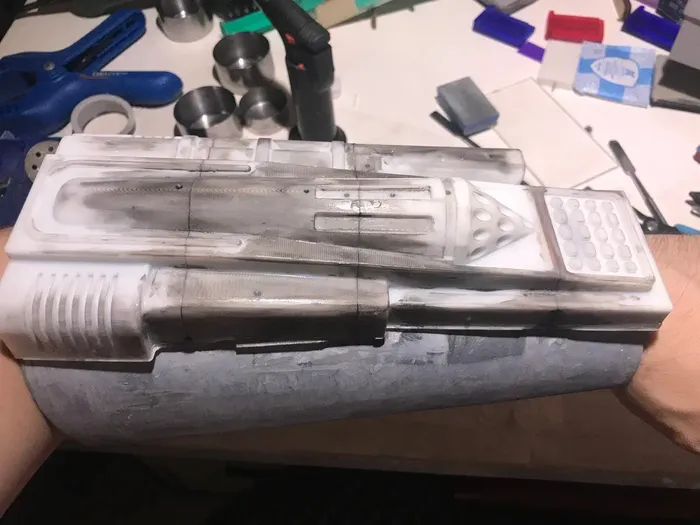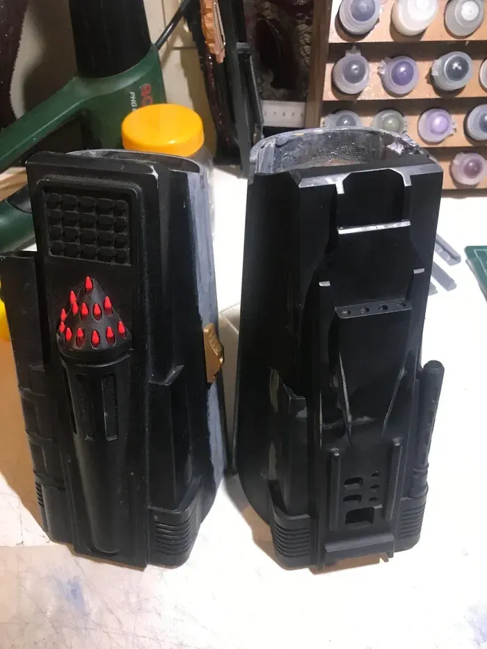 III. Обновление Собственно при заливке термальников не обходится без дефекта ввиду отсутствия вакуумной камеры, но ничего неисправимого после, хотя иногда и внешний вид немножечко страдает. Но попытка сделать более удобную в заливке сборную модель корпуса оказалась еще менее удачной, поэтому пришлось вернуться к изначальной с минимальным изменением в месте заливки смолы. Но основне изменение коснулось бластера - если первые модели были монолитные и была мысль однажды таки заморочиться с более натуральной, то уже потом, когда в морозильнике скопилась куча излишков разведенной смолы, я решил таки сделать полностью по уму (спойлер - идея требует существенной доработки и результат литья меня не устроил). Поэтому пришлось ремоделировать, а также чуть подправить пару моментов, которые мне не понравились во время покраса монолитного - добавил немного толщины, чуть доработал геометрю