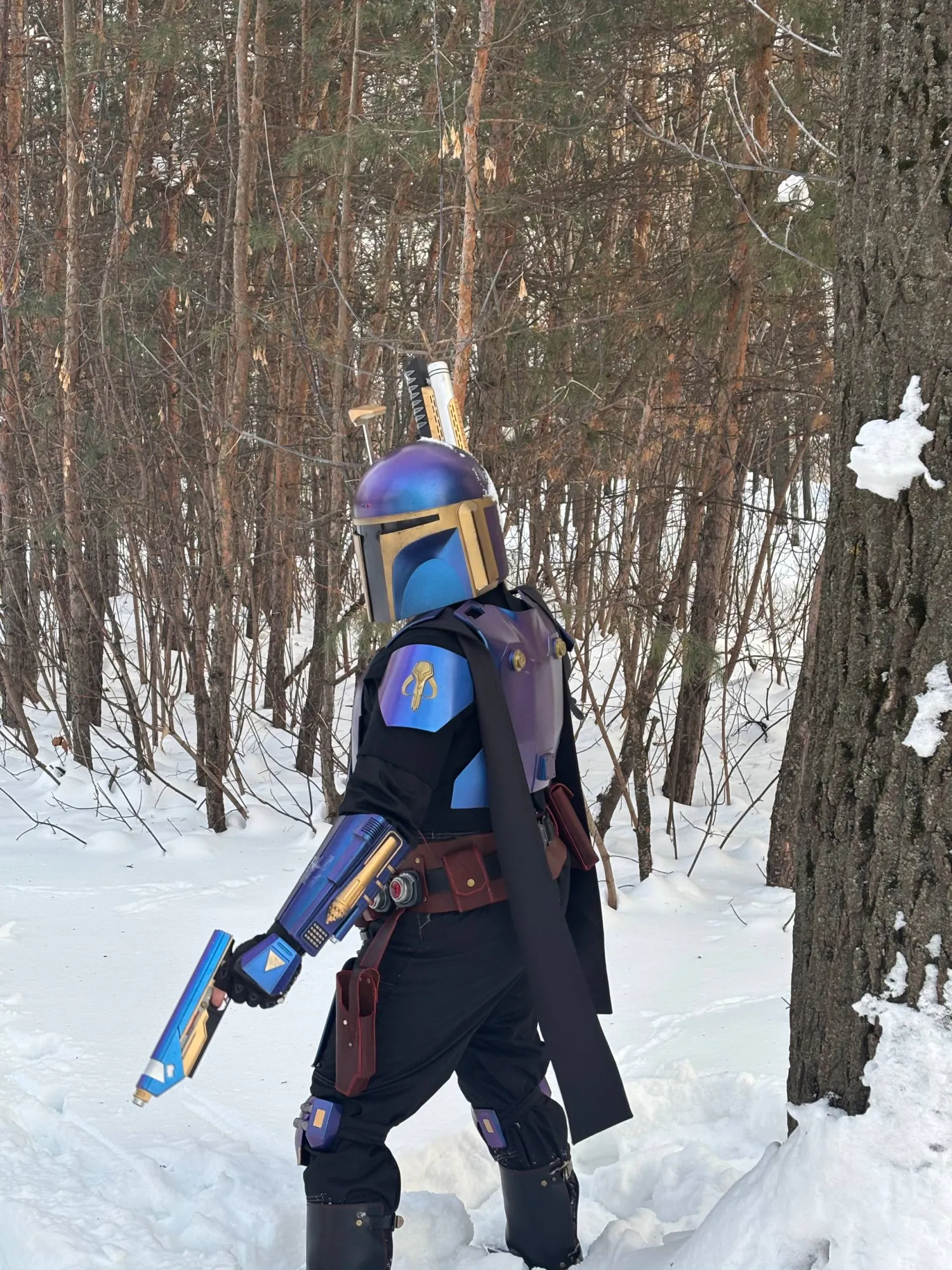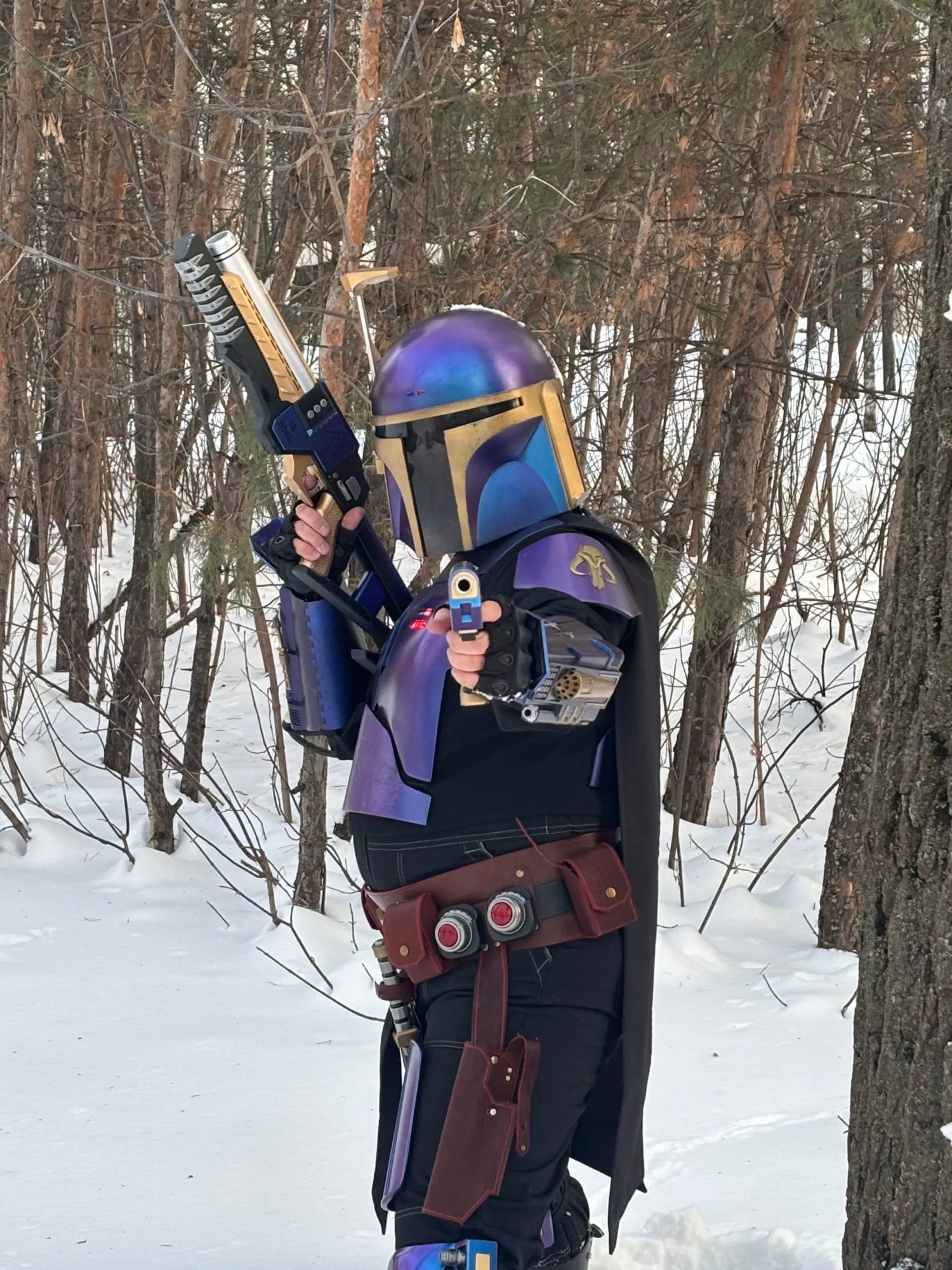 на тот момент получалось так. Многие элементы еще не сделаны, наручи пока напечатанные на 3D-принтере, но будут полностью переделаны с нуля из смолы и редизайнены (печатал чисто как форму для эпоксидной заготовки), а горжет пока скрыт под плащом.