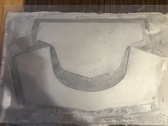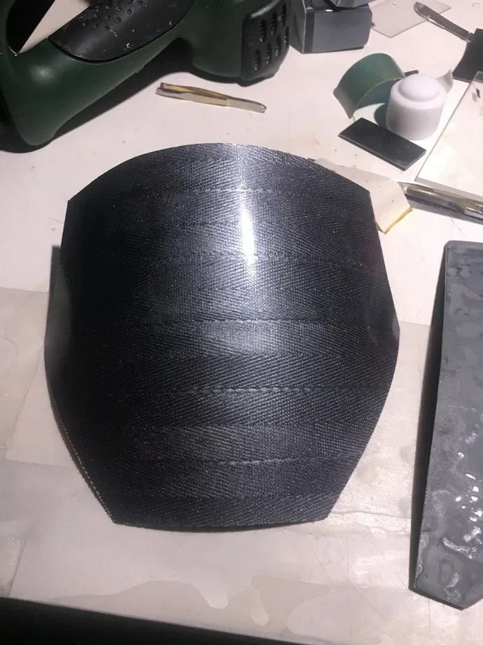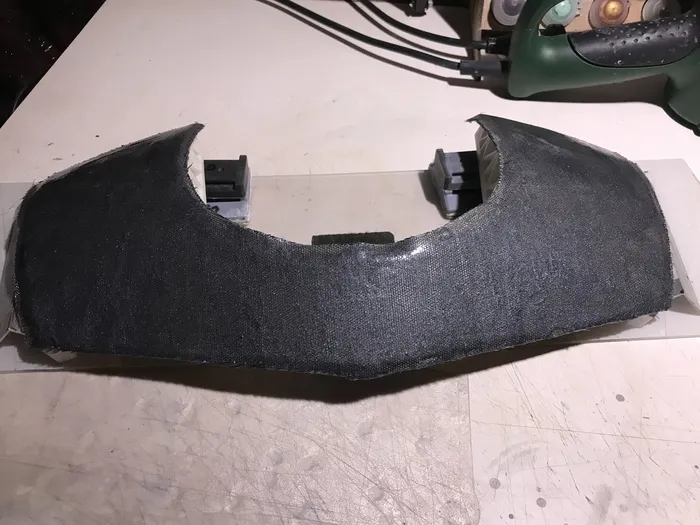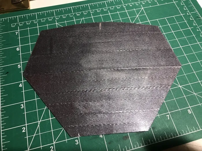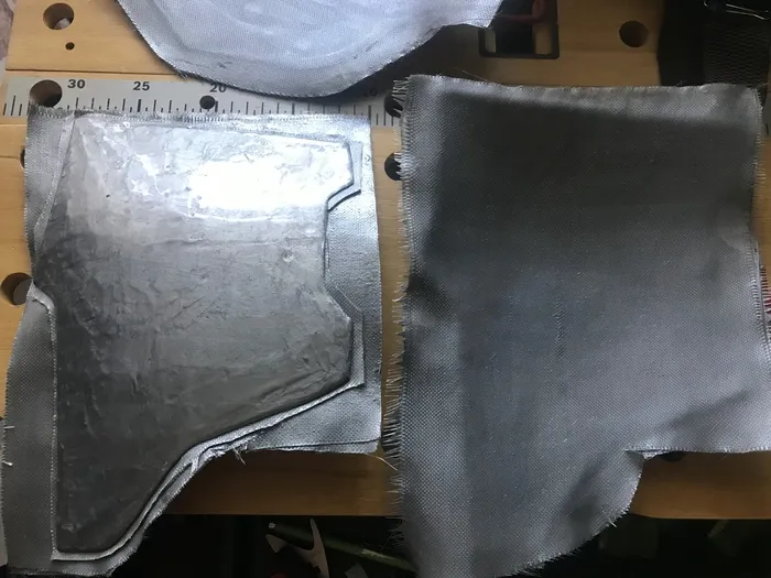 А теперь к ошибке - на первом этапе, как получили базовый контур пластины на стеклоткани надо было не дожидаться полного отверждения, а вынимать ее из пластика на моменте, когда смола уже не клеится, но еще мягкая. и тогда придавать форму. И это я реализовал на наплечнике