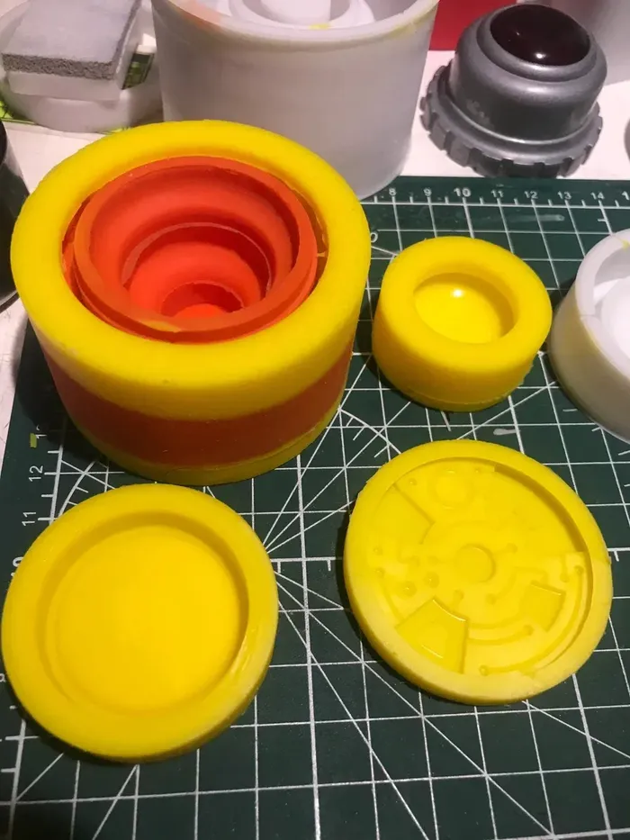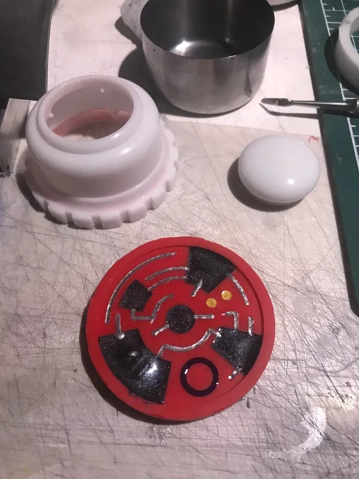 Тут у меня весь процесс сразу - смола, молды с уже залитой смолой и конечный результат. Плюс еще отдельно держатель для термальника, который будет крепить его к поясу.