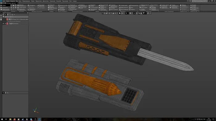 теперь надо сделать кинжал. так как есть 3д-принтер, то самым оптимальным способом будет смоделировать и распечатать. но так как не охода лишний раз возиться с краской - делаем детали не просто так, а для изготовления силиконовых молдов деталей, чтобы отлить из смолы сразу более-менее нужного качества.