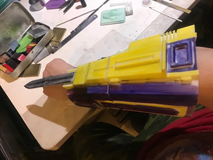 Теперь самое мутороное - приделать напечатанное к сделанному - тк вопросом совместимости (кроме чисто габаритных) я на обоих этапах не задавался, да и это была бы пустая трата времени. Поэтому начинаем портить распечатку стачиванием боков под размер наруча сажаем сперва все на суперклей, чтоб потом, конечно же, заэпоксидить щели