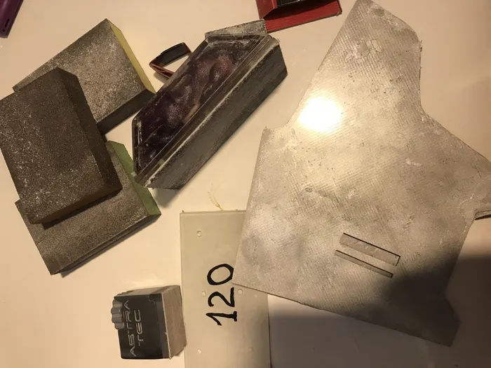 и далее проходим по заготовке абразивной губкой, берем еще стеклоткань, промазываем смолой и покрываем сверху. и так в пару слоев, после застывания покрываем уже чисто смолой, которой дали полимеризоваться до степени пластилина. ждем застывания, потом шлифуем.