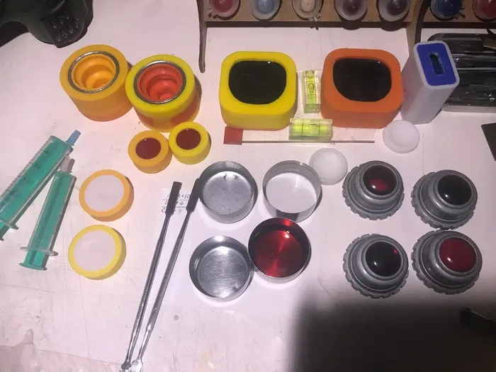 заливаем молды смолой. так как изначально это печаталось, то мы можем посмотреть объем затраченного на каждый элемент фотополимера и не париться с тем, сколько эпоксидки нам потом понадобится. поэтому разводим несколько банок смолы сразу с нужными пигментами и заливаем в молды