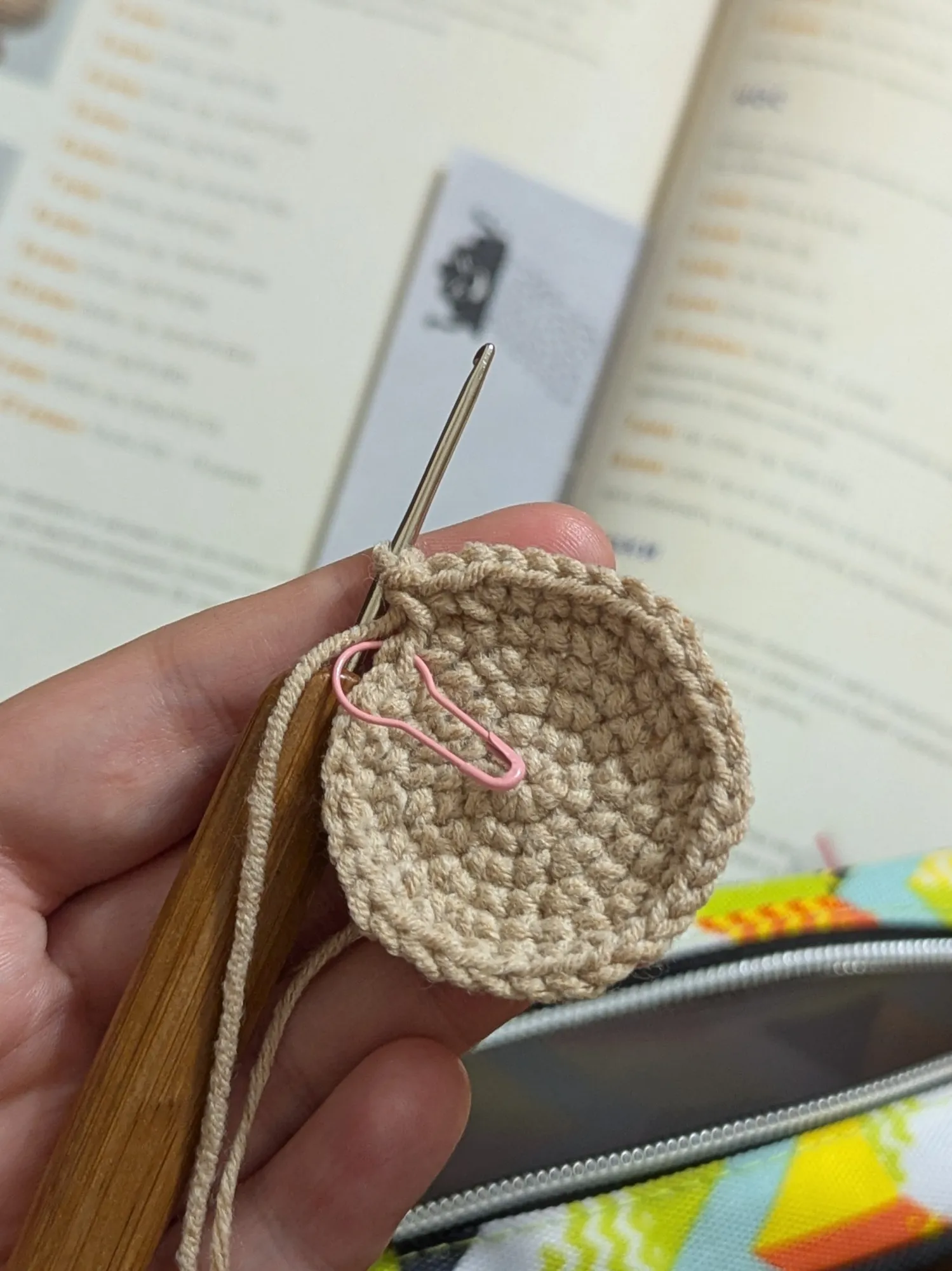 Здесь используется не совсем стандартное вязание: не галочками и не крестиками, а «в раскол» – то есть нужно заводить крючок не в петлю, а как бы между ними. Кроме того, вязание идёт не спиралью, а отдельными рядами.