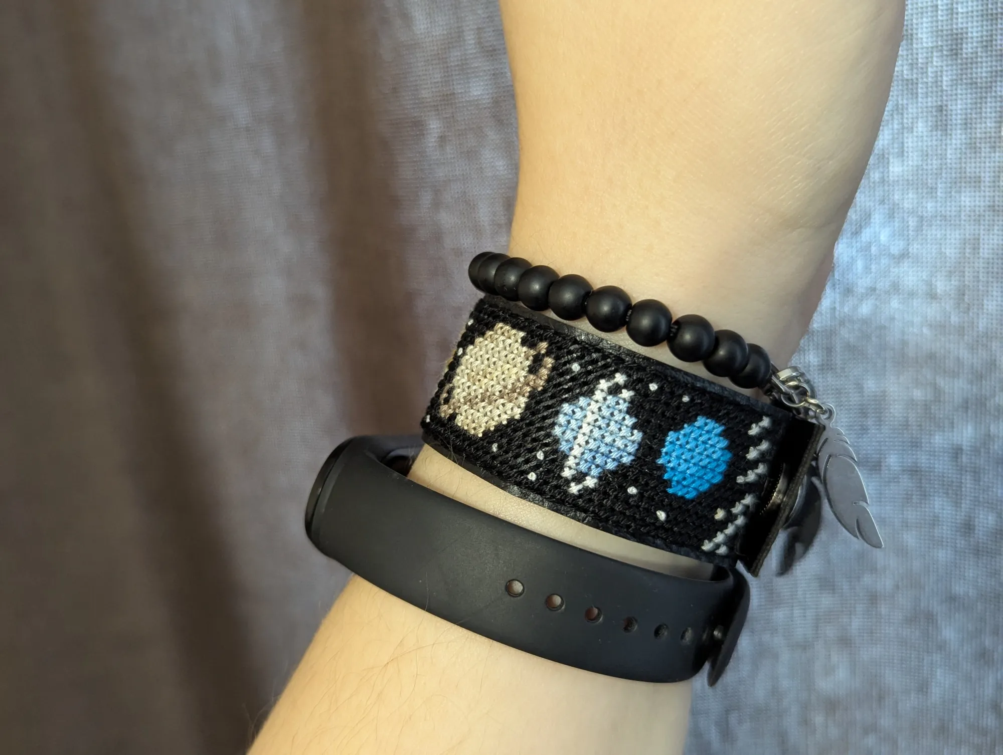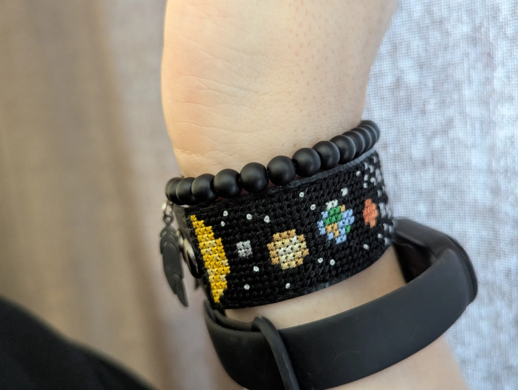Уже давно заметила, что мой вышитый браслет порядком истёрся, и наконец решилась срукожопить срукоделить новый. До этого я покупала готовый набор: нитки и схема шли в комплекте с заготовкой из кожзама. Сейчас у нас такие наборы уже не продают, так что я купила другую заготовку, а схему решила нарисовать сама.