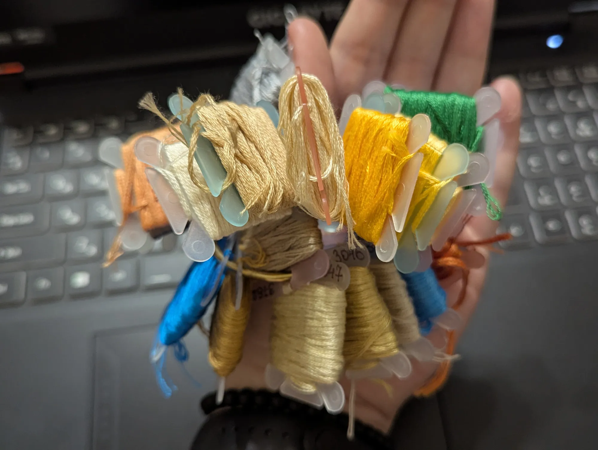 Начинаю подбор. Большого количества цветов ниток я не боюсь: палитра у меня имеется почти полная, да и частая смена нити не напрягает. Так что можно смело использовать столько цветов, сколько того требует сердце.