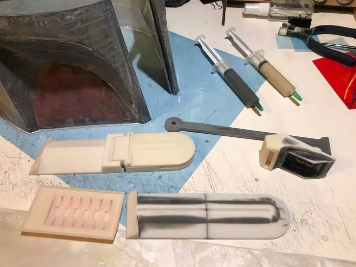Теперь вторая по геморройности проблема - задняя решетка и "уши" с целеуказателем. Рондо я не пользуюсь очень давно (да и не люблю), эпоксидный пластилин нынче говно, а еще у меня есть 3D-принтер. поэтому их я уже не стал делать в ручную, как раньше, а тупо сделал в Компасе и напечатал (иначе нахрена я принтер покупал?).
