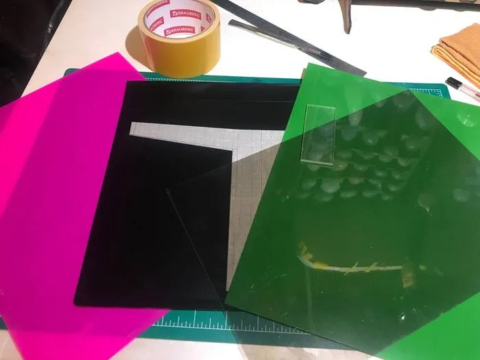 Что потребовалось: 2 листа пластика (единственное, чего у меня тогда небыло), миллиметровка (размер и форма линзы немного отличаются от изначальной в схеме, как и метод ее крепления), пластик с папок-скоросшивателей (остался в обилии с других проектов) и двусторонний скотч.