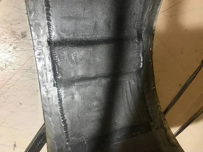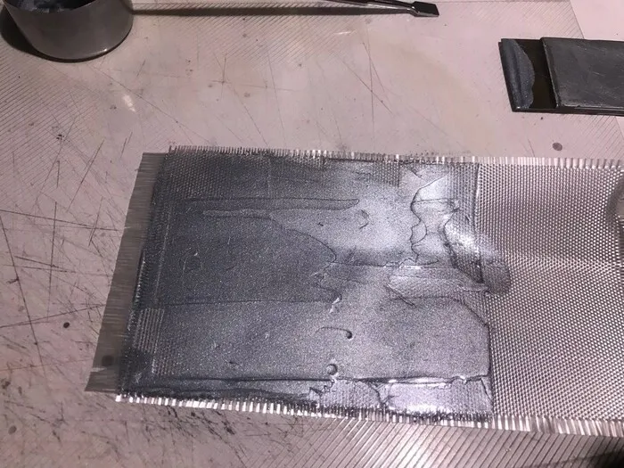 А теперь опять беремся за стеклоткань (и чешемся весь вечер), промазываем его эпоксидкой и клеим изнутри для укрепления решетки.