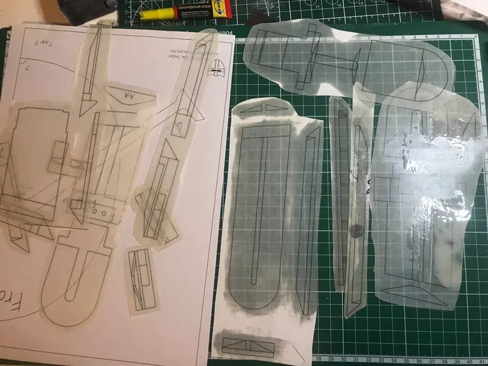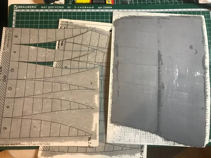 Итак, я начал делать новый. Никакой стальной проволоки - только эпоксидка, 2 слоя арамида (остался с пары других "проектов") и стеклоткань (сейчас я то понимаю, что тогда пожадничал и надо было больше слоев стеклоткани и меньше чистой смолы, но не суть). Я взял распечатки, пропитал их смолой, верхнюю часть также сразу укрепил малярной сеткой (стоб сделать хоть небольшой слой смолы под стеклотканью и начал собирать их по отдельности (а выше упомянутые детали помогали не налажать с размерами)