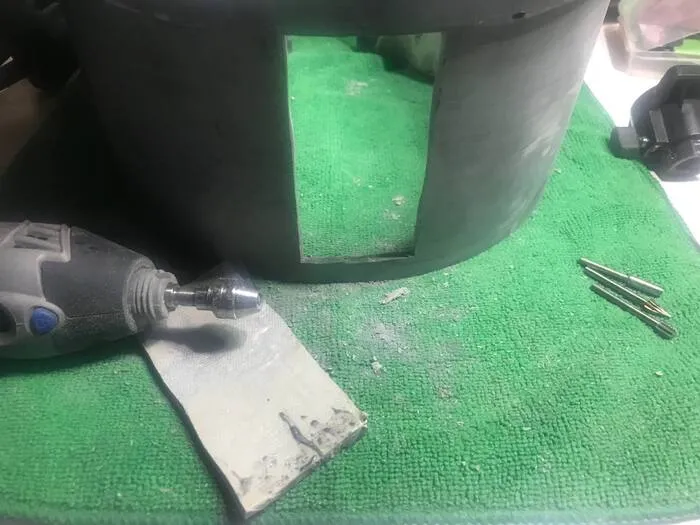 И опять нам пригодился пластик от папок, который также склеиваем двусторонним скотчем и приклеиваем к шлему. беру длину с запасом - все лишнее снимет гравер (был бы полностью склеен - этот процесс бы бы на порядок сложнее). Сверху приклеиваем еще листового пластика, чтобы залить смолу в получившуюся щель. Ждем застывания, снимаем лишнее гравером с фрезой снизу, вручную сверху. и пока гравер под руками - делаем пропил под "решетку".