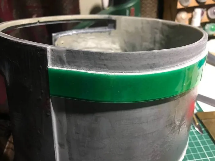 И тут мы выясняем, что несмотря на то, что внутри у нас полное соответствие размеров, снаружи у нас немного хрень (и не только из-за щелей между частями) - отступы от края разных размеров, придется наращивать - все тем же методом - делаем замкнутую ленту из пластика в толщину нужного отступа от окантовки шлема, приклеиваем на двусторонний скотч и заливаем смолу.