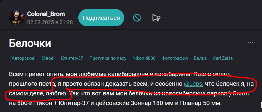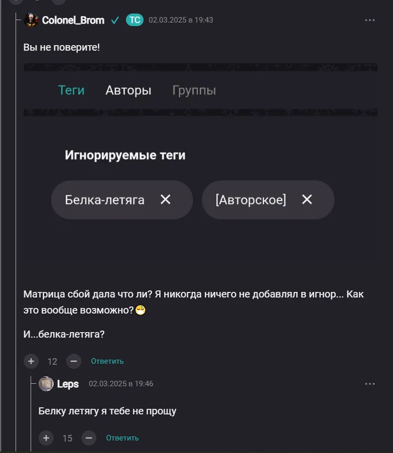Да чет там было. А, вспомнил! Сначала Кошь на меня обиделась, когда я сказал что фото белок это несколько банально. А потом ещё случился глюк с тегами, и у меня в игноре оказались несколько тегов, в том числе "белка-летяга", после чего Лепс пообещал(а) что не простит мне нелюбовь к белочкам. Потому пришлось делать пост-доказательство что я люблю и постоянно фотографирую белочек:)