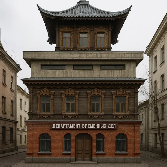 Департамент Временных Дел располагался в здании, которое выглядело так, словно его строили несколько архитекторов, каждый из которых ненавидел работу предыдущего. Первый этаж был классическим викторианским — красный кирпич, арочные окна, чугунные решётки. Второй этаж внезапно становился в русском стиле — деревянным, с резными наличниками. Третий этаж и вовсе был модернистским бетонным кошмаром с окнами-щелями. А крыша... крыша была японской пагодой.