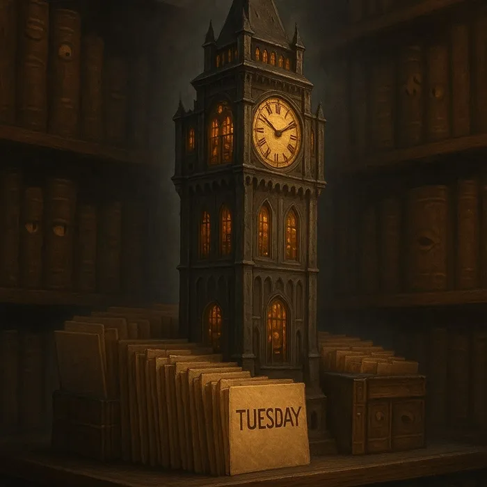 «Бери свои записи,» — Коллекционер махнул рукой, и папки поднялись в воздух, выстроившись в аккуратную стопку. — «Все украденные вторники задокументированы. Прочти их вслух. Вспомни каждый. И они вернутся.»