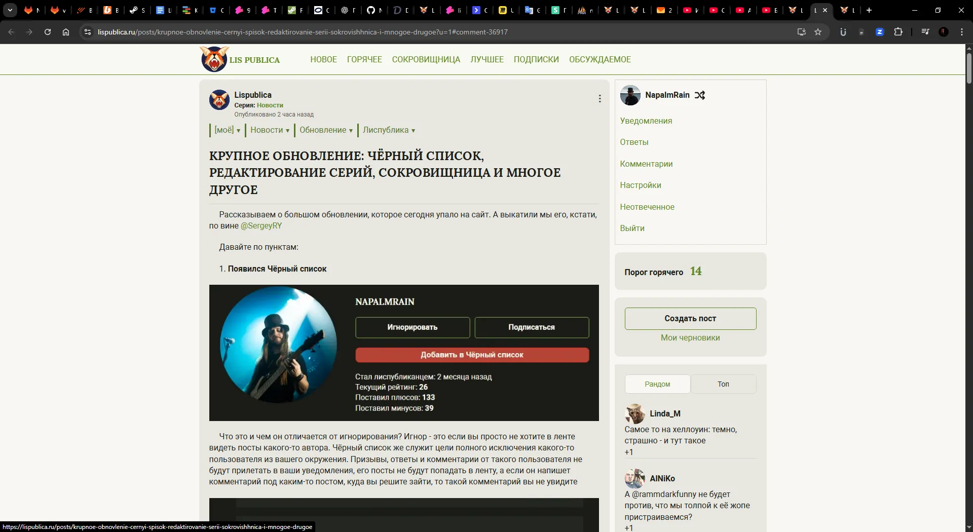 3. Оценки постов и комментариев. Кнопки увеличились в размерах, дабы с мобильных устройств в них можно было попасть. А ещё они теперь реагируют быстрее и надёжнее на нажатие. Шанс профукать проставленную оценку из-за случайного сбоя связи сводится к минимуму (не к нулю, конечно, но всё же).
