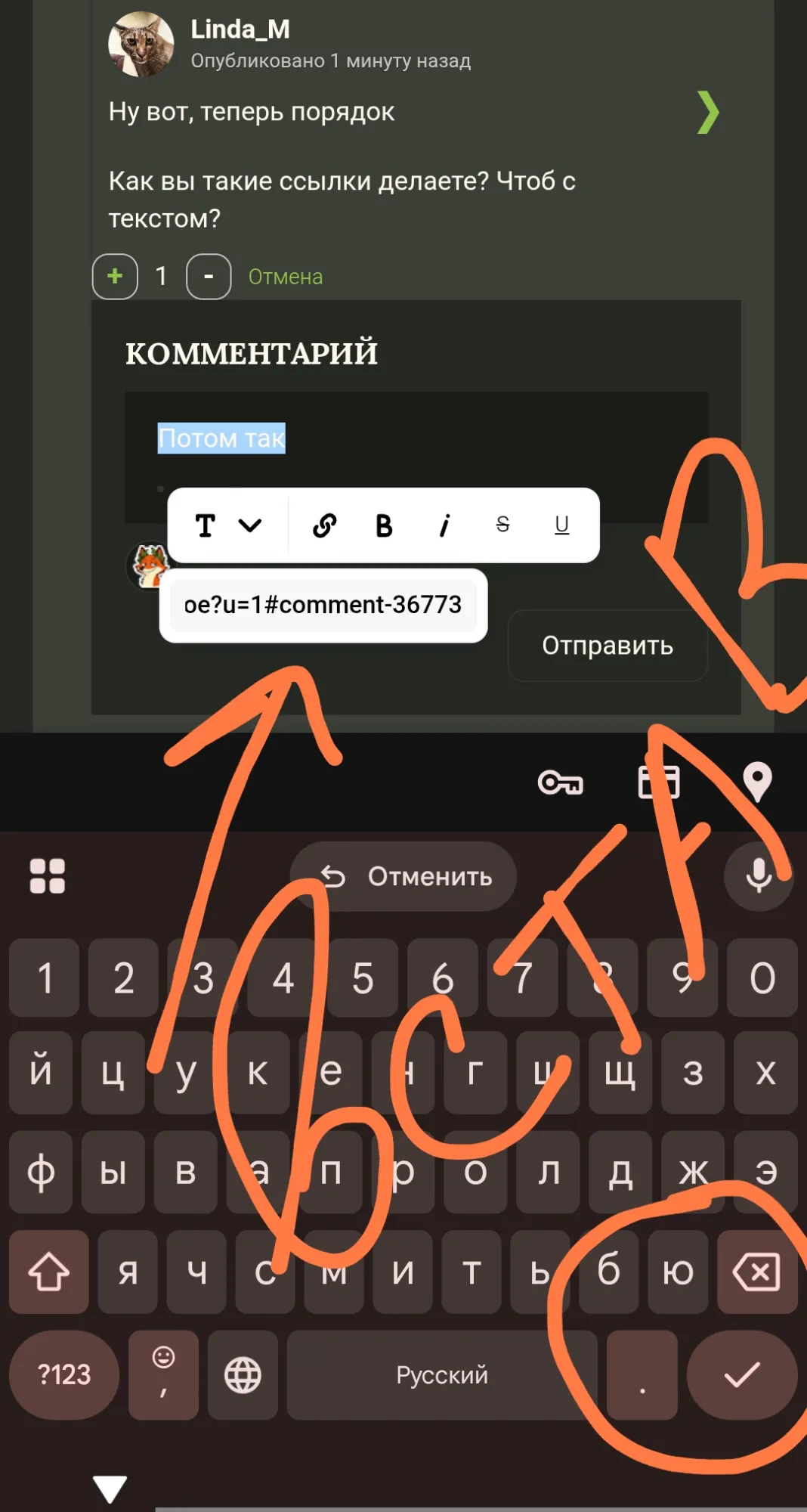 Потом так в редакторе жму на цепочку, и вставляю скопированную ссылку, после того как вставилась нажимаю на галочку отмеченную кружочком