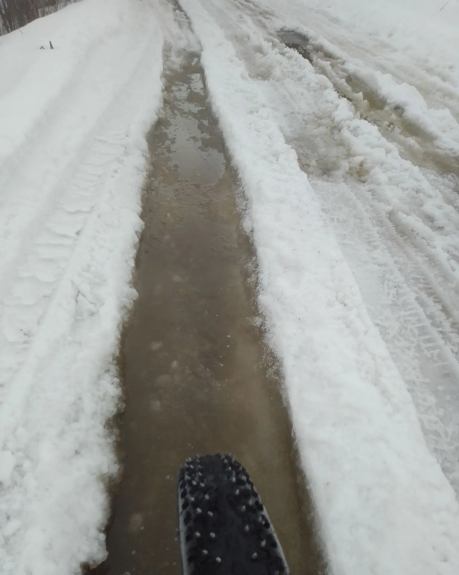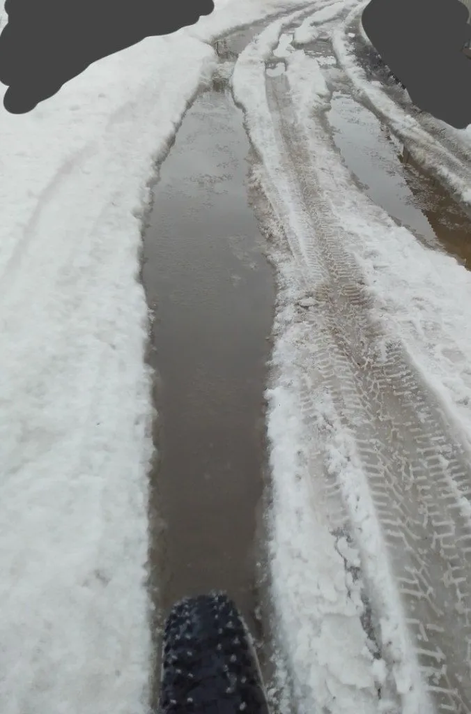 Пробыл ехать по снегу. Заднее колесо начинает проваливаться , и тяжело крутит педали. На узких колесах по снегу было б 🫤🫣. В итоге ехал по колее с водой. Бывало переднее колесо мотыляло в колее, потому что машины плохо накатали там.