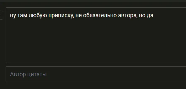 вот и непонятно. я тоже думала, что цитата курсивом. а получается -- когда выделяешь цитату, она автоматом попадает в верхнее поле. сама. без моего участия. а потом в нижнем поле, если я правильно помню, с телефона у меня было уточнение -- автор. то есть там предполагается писать, например, Лев Толстой. поэтому я свои слова писала за пределами всех полей, а когда отправляла -- получалось, что там просто один текст. и я удаляла сообщения.