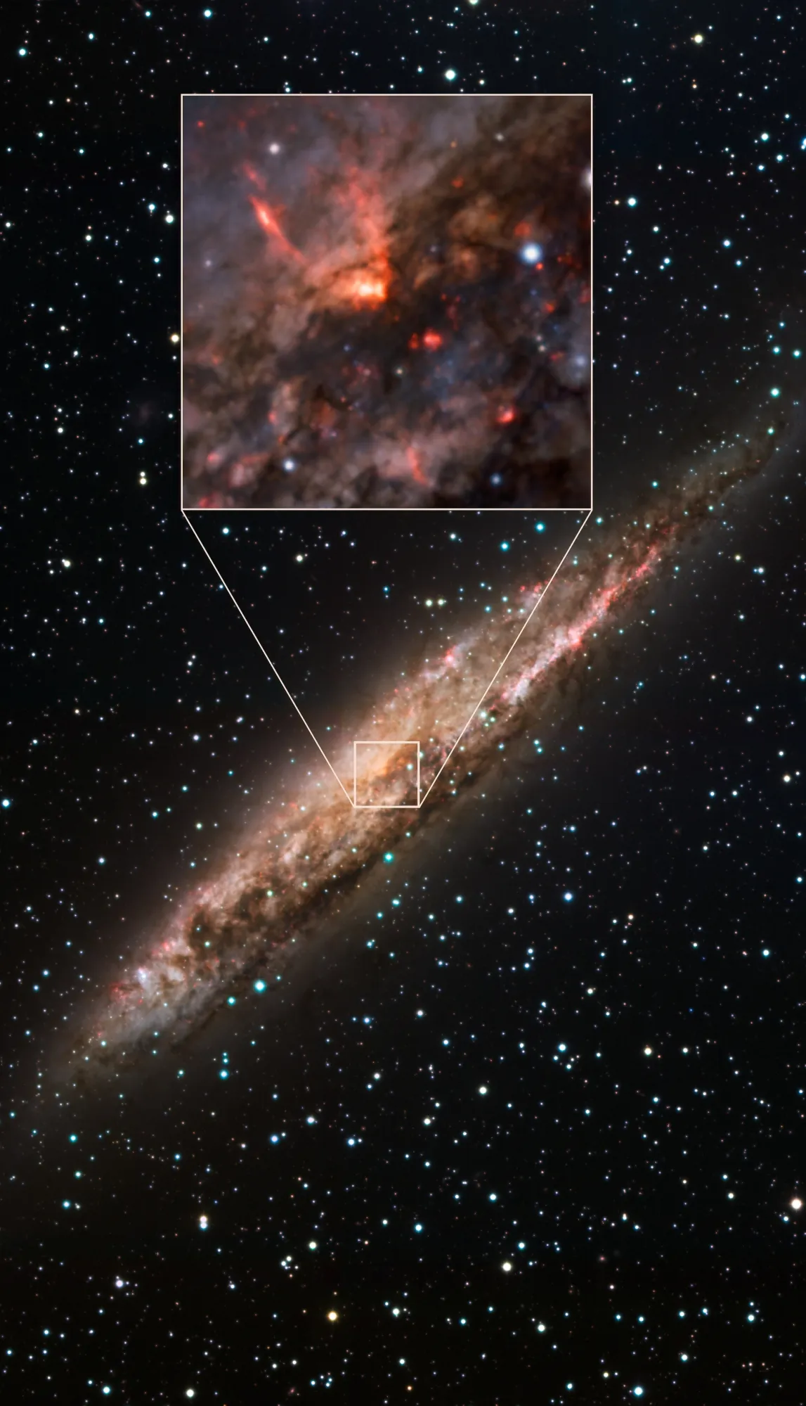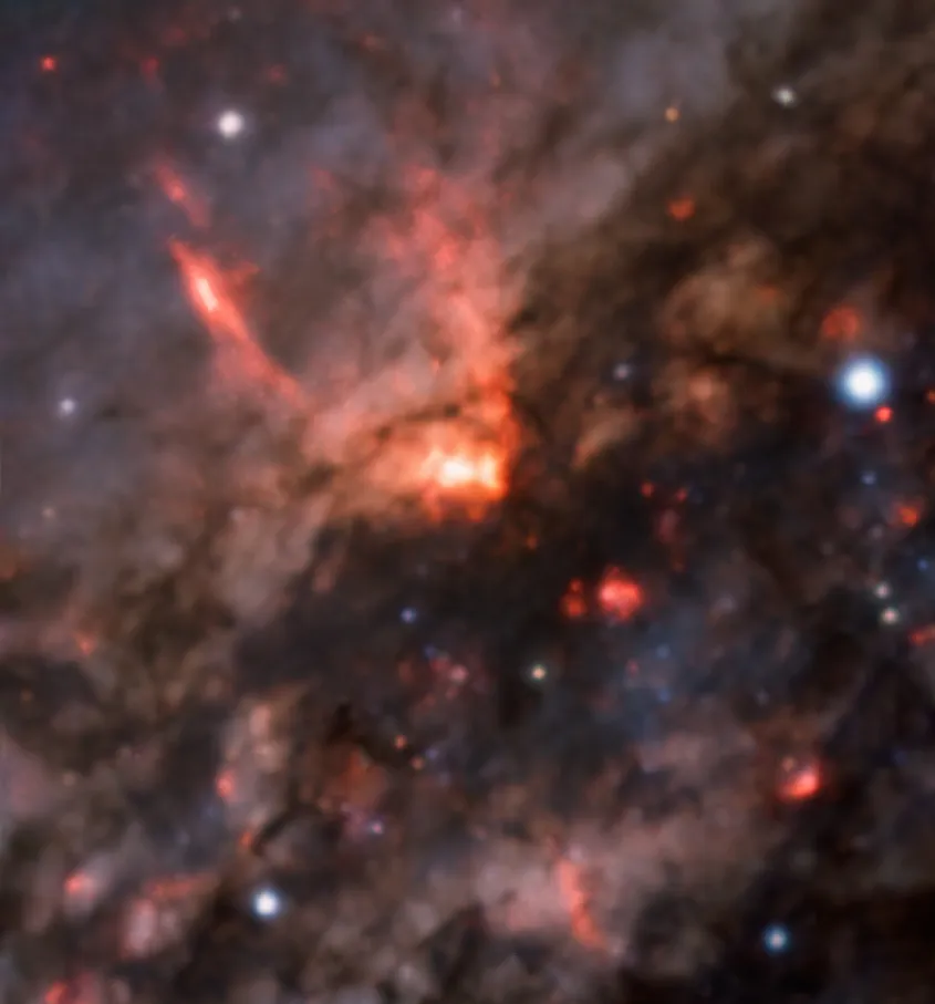 Инструмент MUSE на Очень Большом Телескопе в чилийской пустыне Атакама запечатлел крупным планом мощнейший «галактический ветер» (по аналогии с солнечным ветром), испускаемый активным ядром галактики NGC 4945, - сверхдырой, пожирающей звезды и межзвездное вещество.
