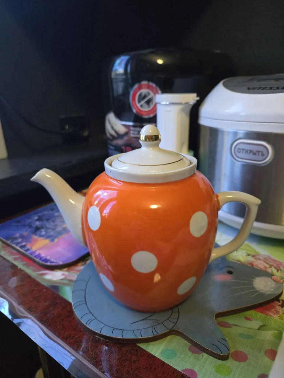 Кстати, у меня у мамы дома есть к такому чайнику кружечки с блюдцами, такие же красные с белыми кружочками. Правда ими активно в свое время пользовались, они такие уже видавшие вид, со сколами и подтеками