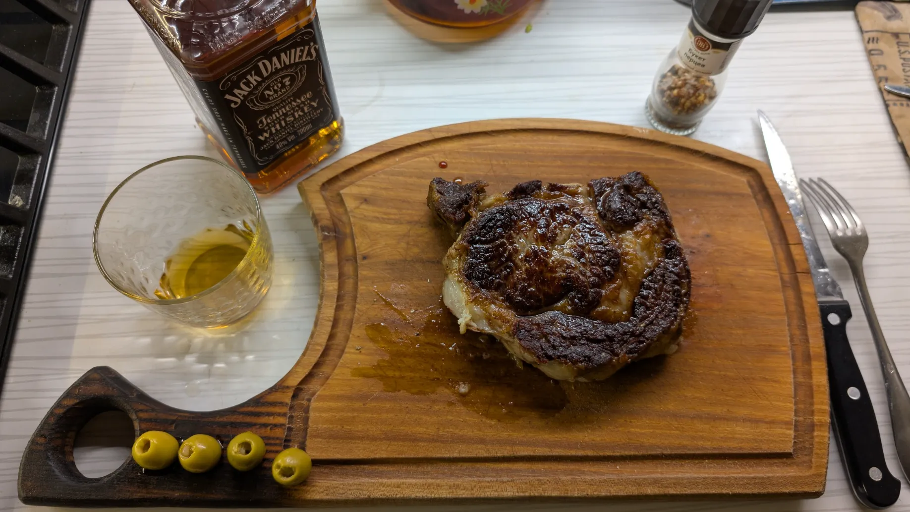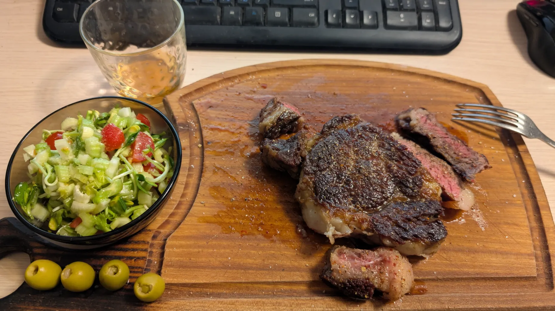 А вот мой сегодняшний стейк. Жирный, но другого не было. Откровенно толстые куски жира обрезал.