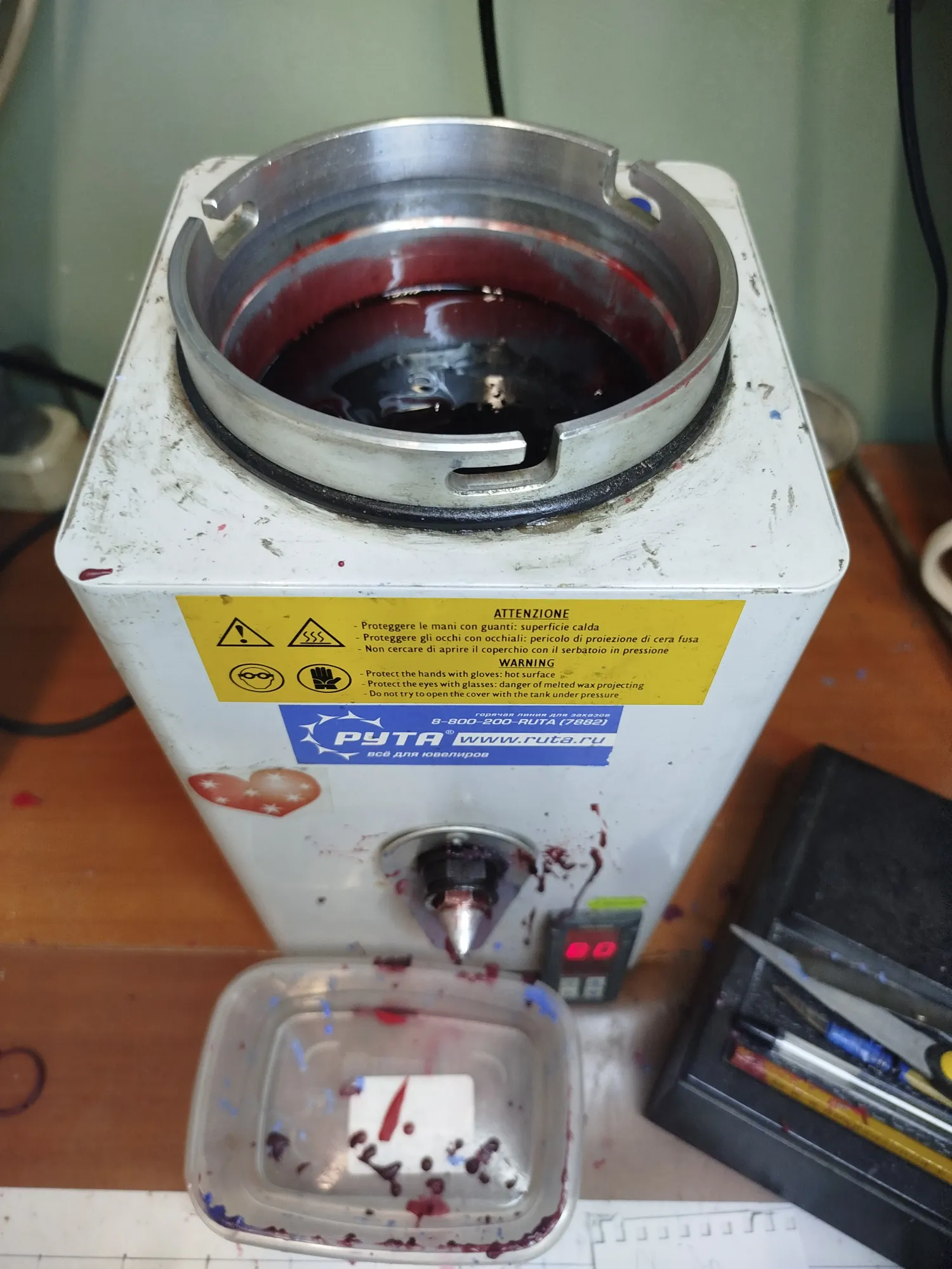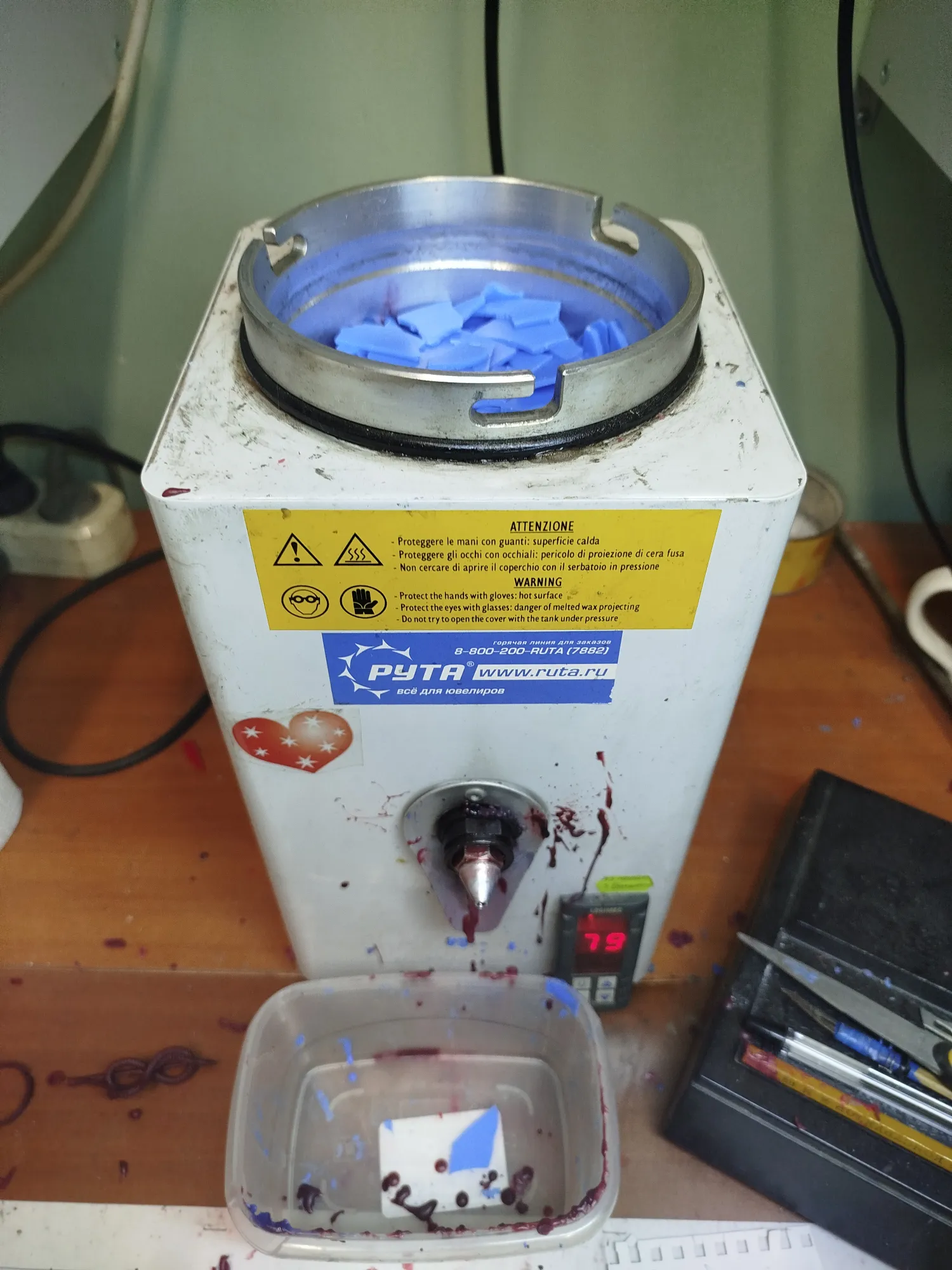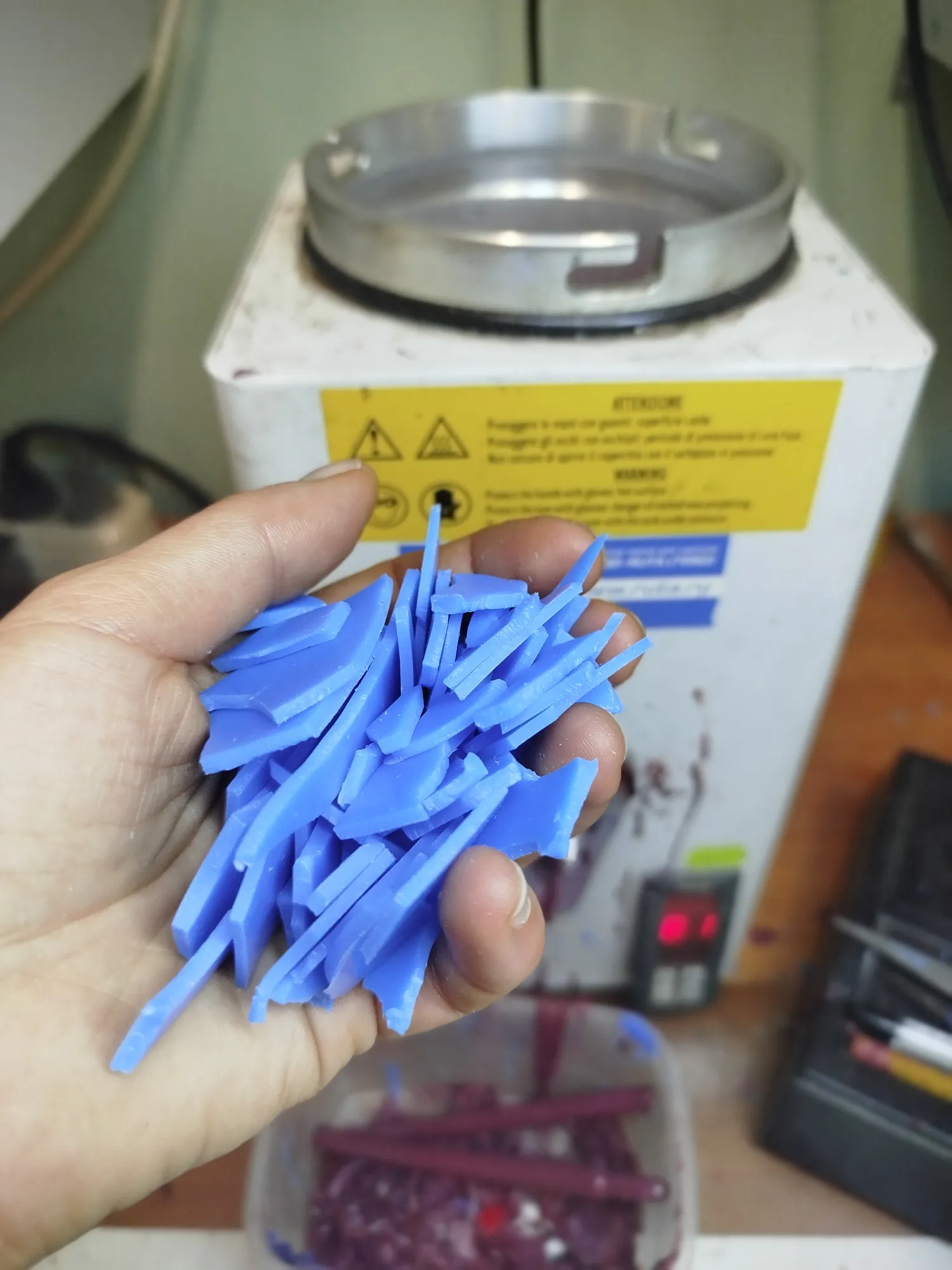 Что бы вам там ни говорили, мешать воск можно. Главное- аккуратно и с пониманием зачем. Универсальный воск я делаю из синих и красных чешуек покупных. Потому как перетапливать свечной воск для ювелирки не стоит- сильно разочаруетесь в профессии.