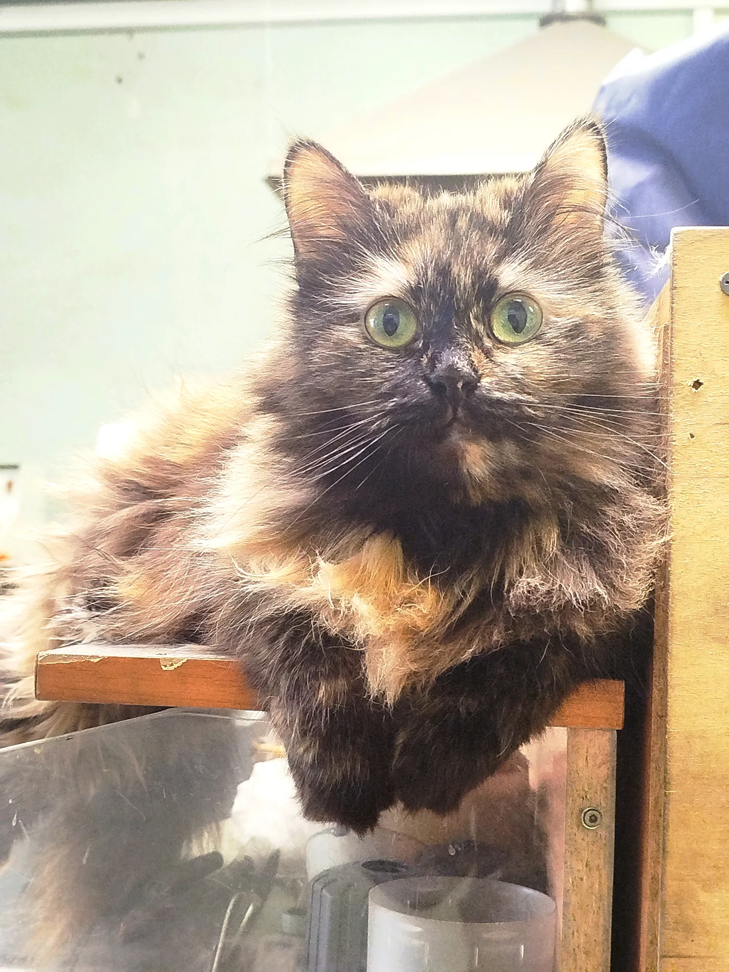 это девочка. их тут двое- она и ее брат, Рыжий, мелькал уже у меня где-то. Мы их отловили с улицы, кошка окотилась дворовая на территории, так и живут на производстве. У них автопоилка, автоматический туалет и безлимит любого корма. Поставлены на довольствие и наблюдаются у врача, по необходимости. На длинных выходных и праздниках тут график дежурства, к ним коллеги приходят кто рядом живет. А еще у нас есть пëс-Джокер, но он живет в будке на территории. Также на довольствии и под присмотром-сейчас вот чет приболел