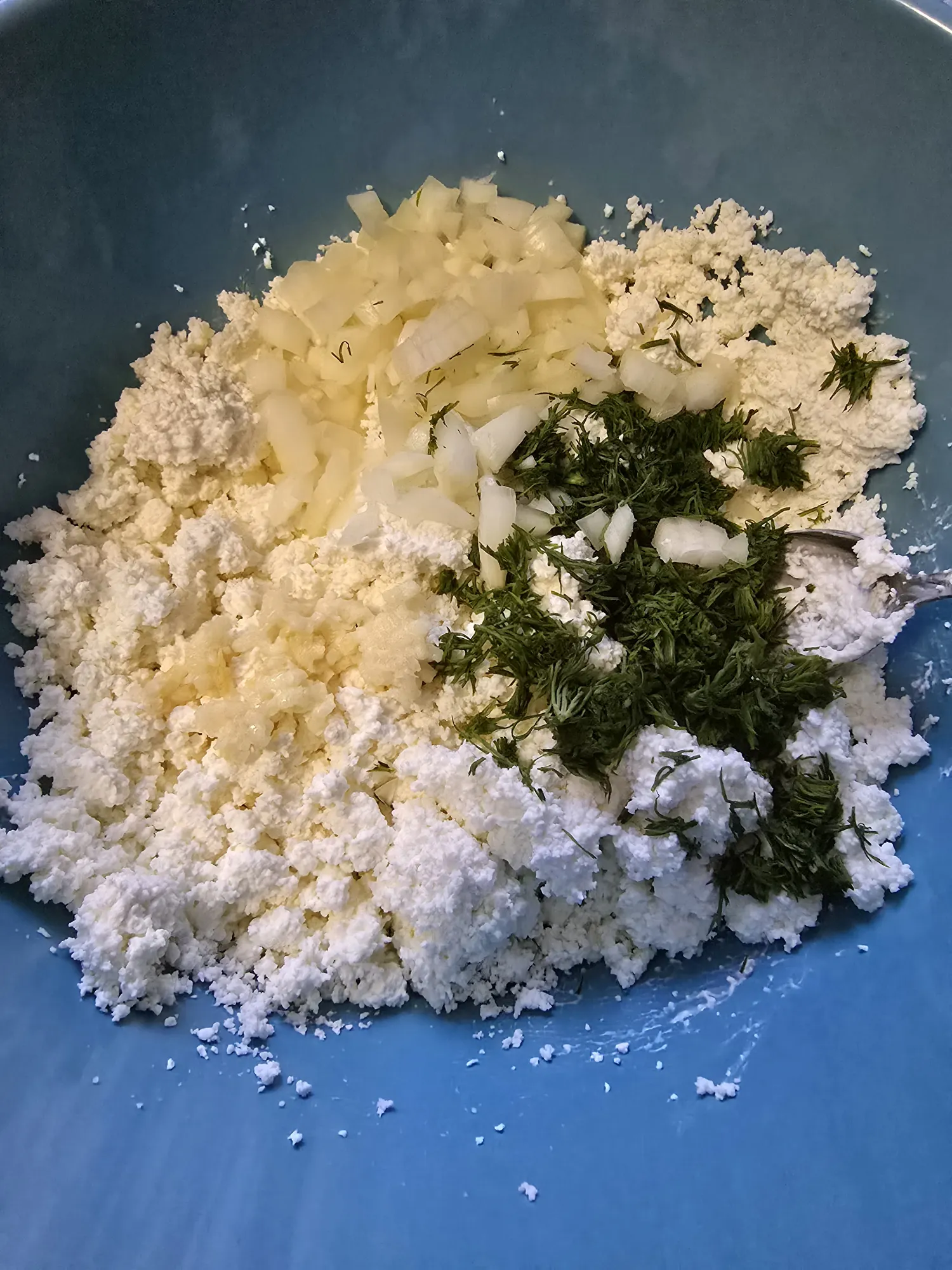 творог, чеснок, яйцо и зелень. тоже норм. Можно сразу и в пирожки. с луком не пробовал.