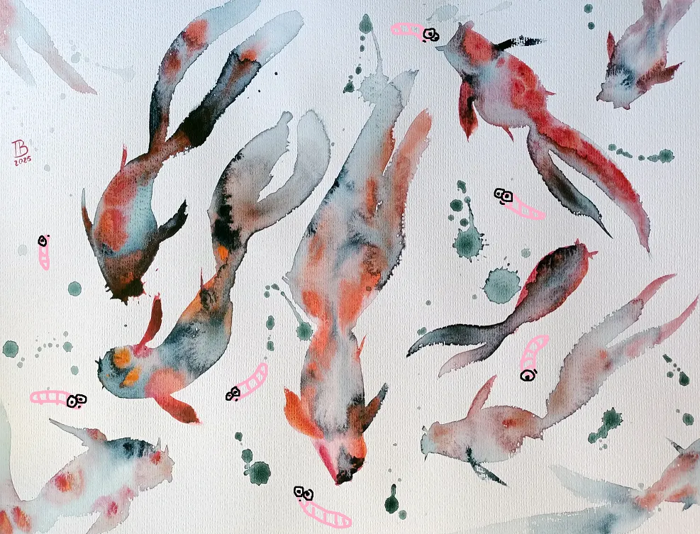 На целлюлозе конечно не то пальто, но тоже интересные растекания получаются. Думала - возьму А3 и нарисую больше рыб. Фигушки, так не работает! Нарисовала более крупных рыб )))