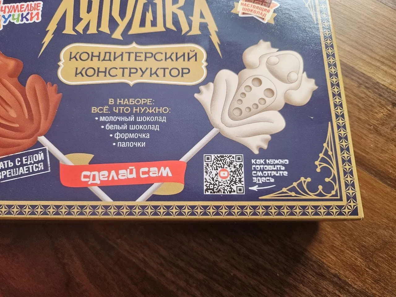 Из нее понятно, что пакетики с шоколадом надо залить горячей водой, подождать, залить формочки и убрать в холодильник. Температура горячей воды не указана, время ожидания не указана. Время в холодильнике тоже.