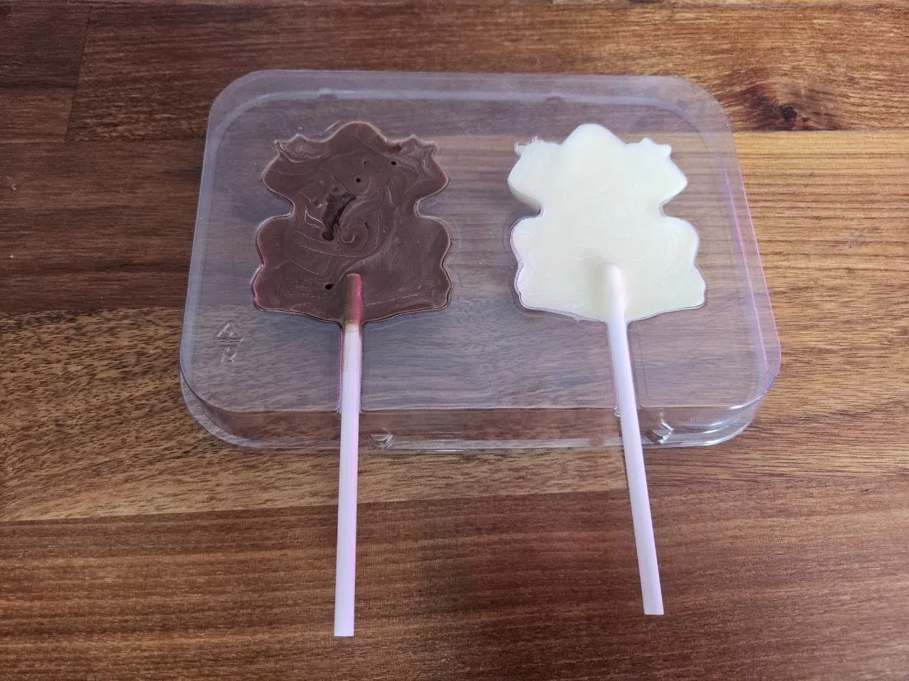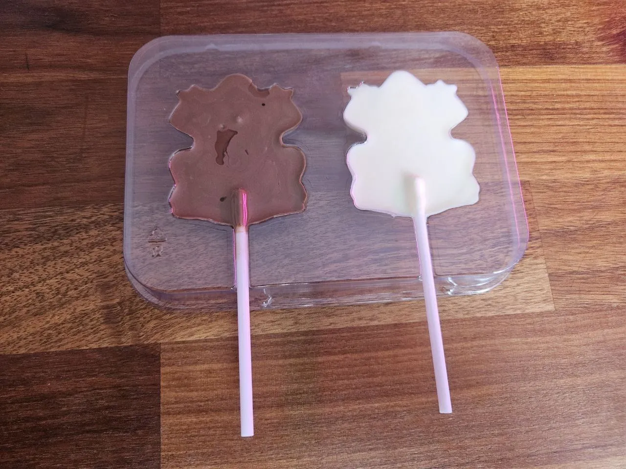 Пакетики вынимаем, обрезаем с одного конца и выливаем в формочки. Обстукиваем об стол обязательно (Про это производитель тоже благоразумно промолчал). Консистенция очень жидкая, гораздо более жидкая, чем у того шоколада, что я использовал для грибочков.