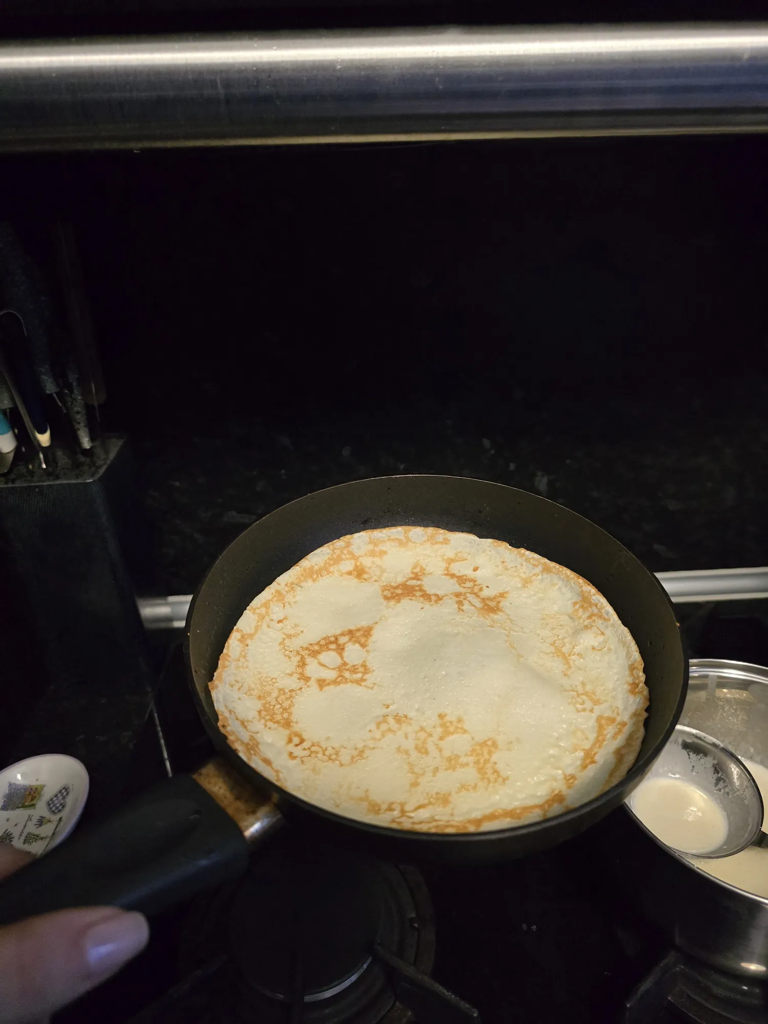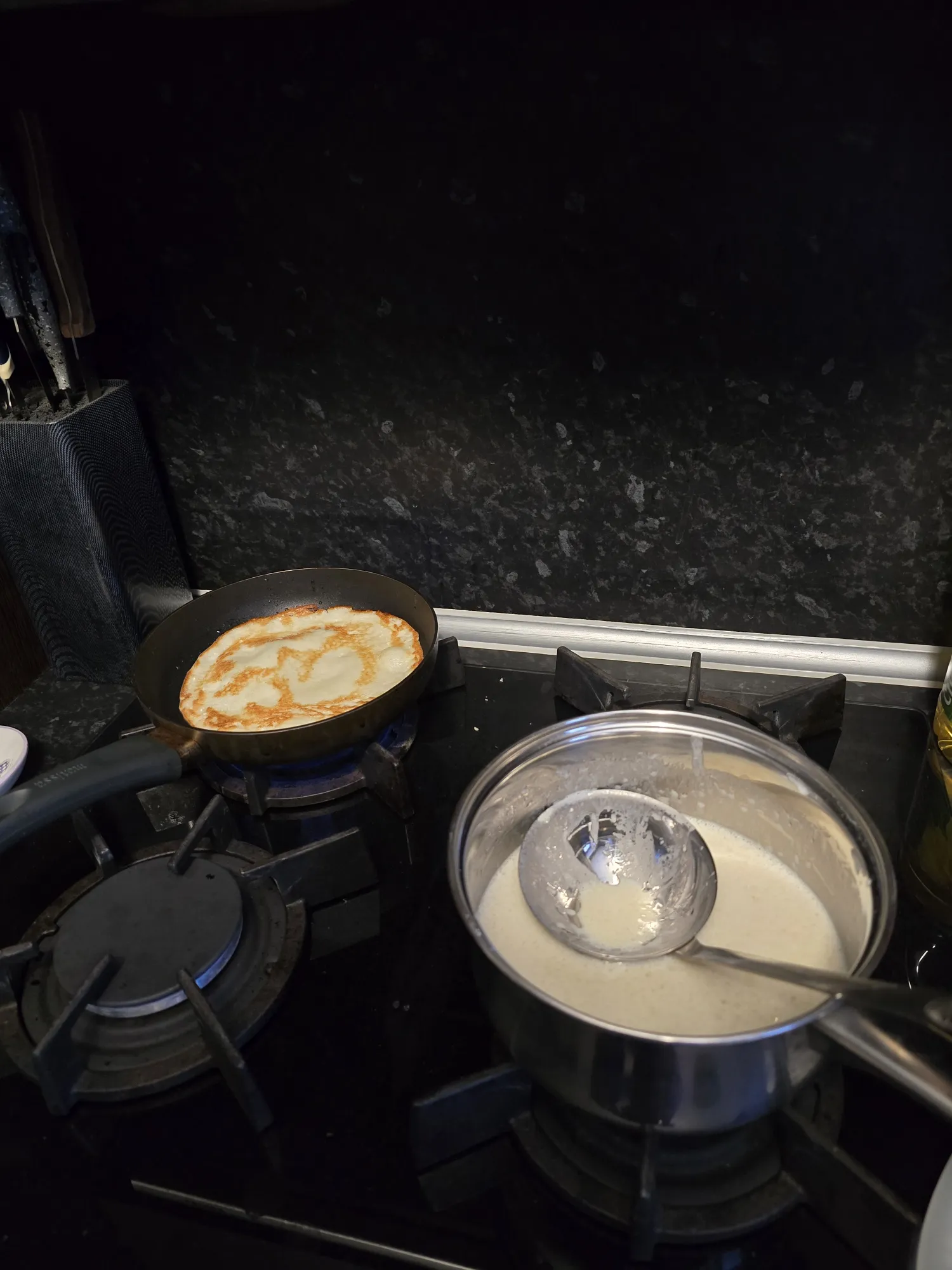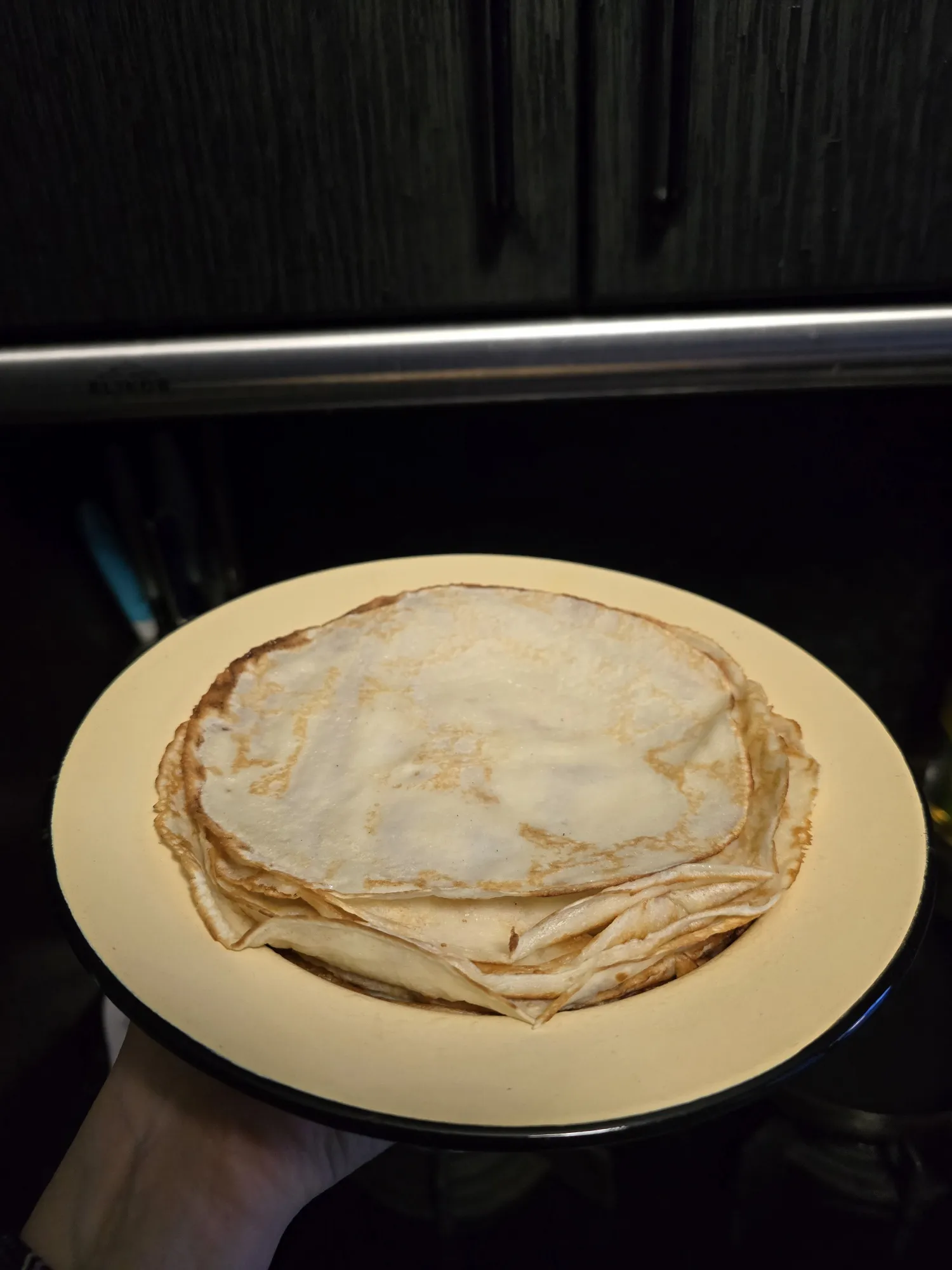 Поэтому, откопала я мамин рецепт блинов и начала делать дабы повторить... На этот раз сразу делала на тефлонке и они у меня получились. С первого, блять, до последнего.