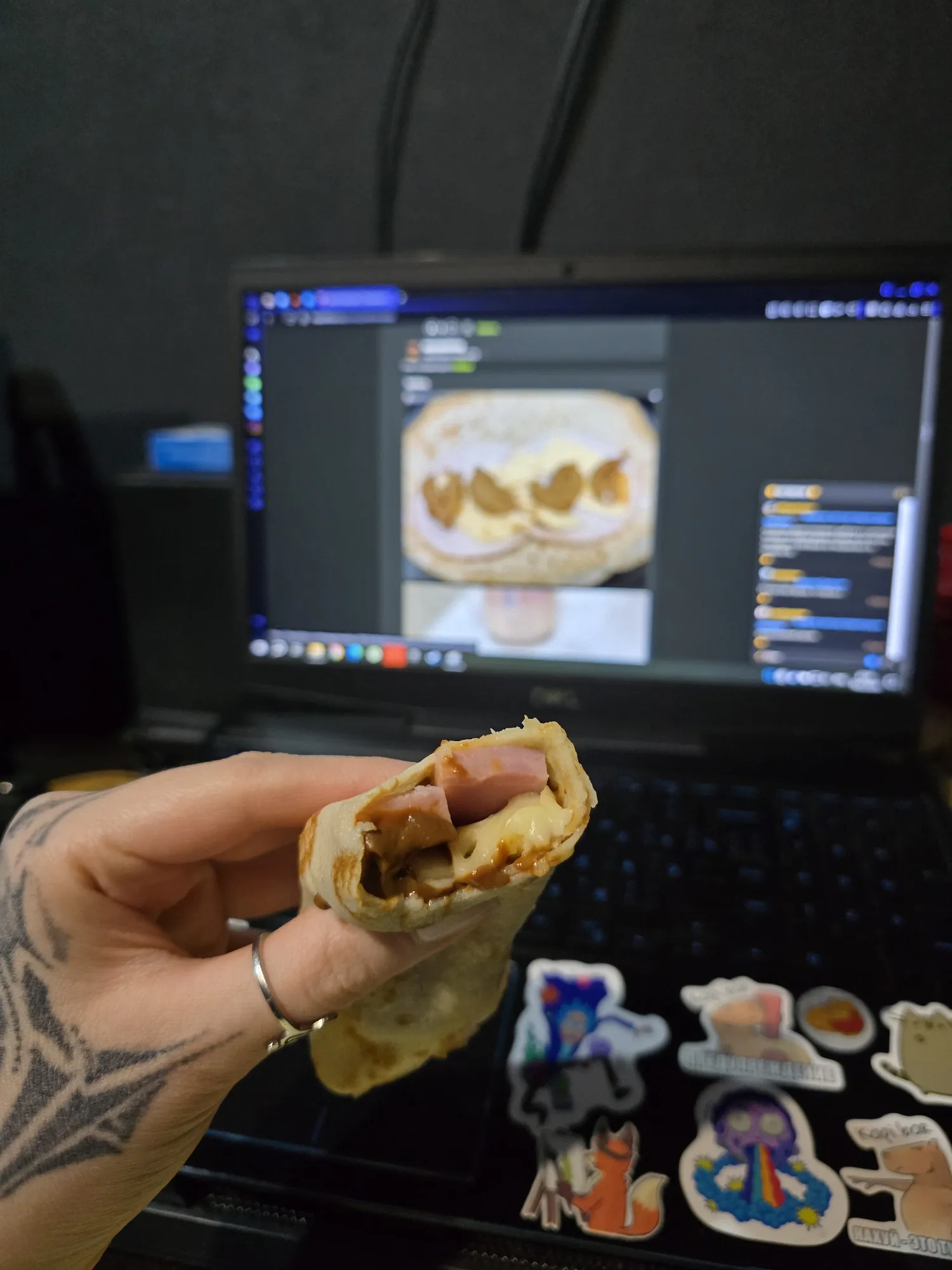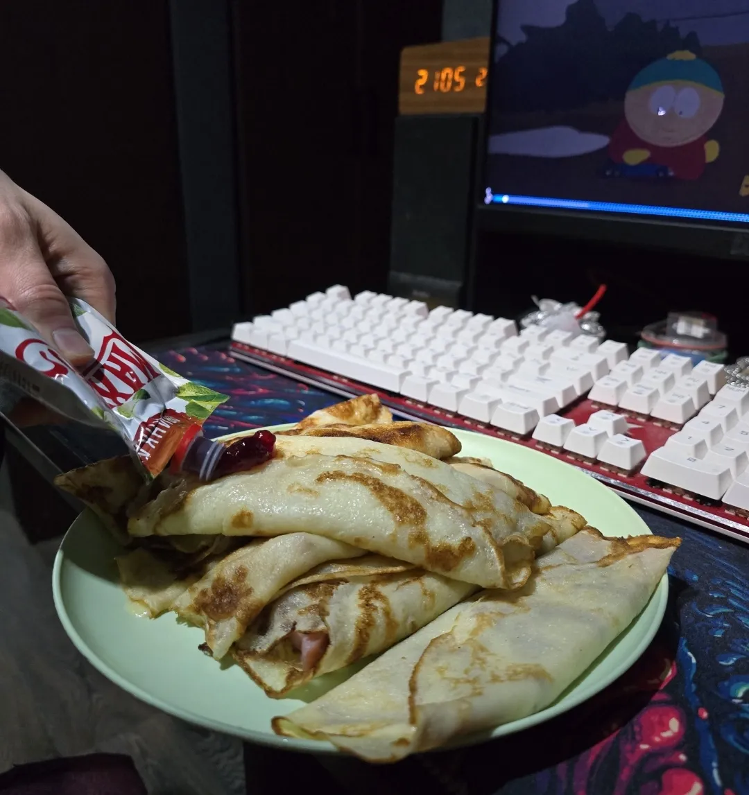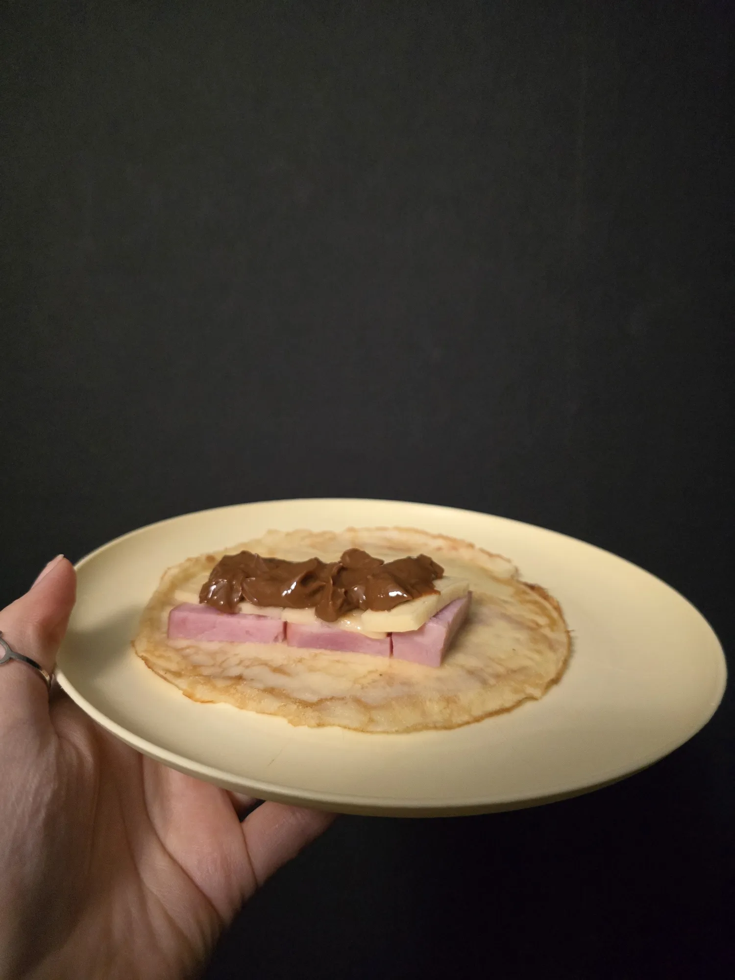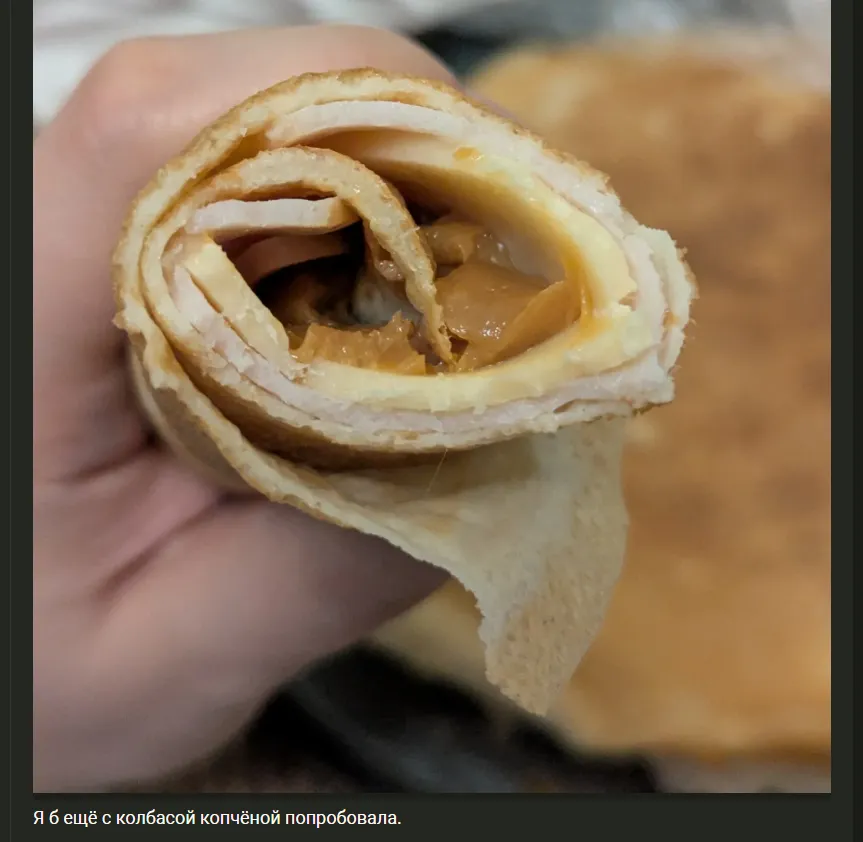 А я сегодня на работе ела блинчик с шоколадной пастой и заедала его рулетиком из ветчины с сыром. Было кстати очень вкусно.