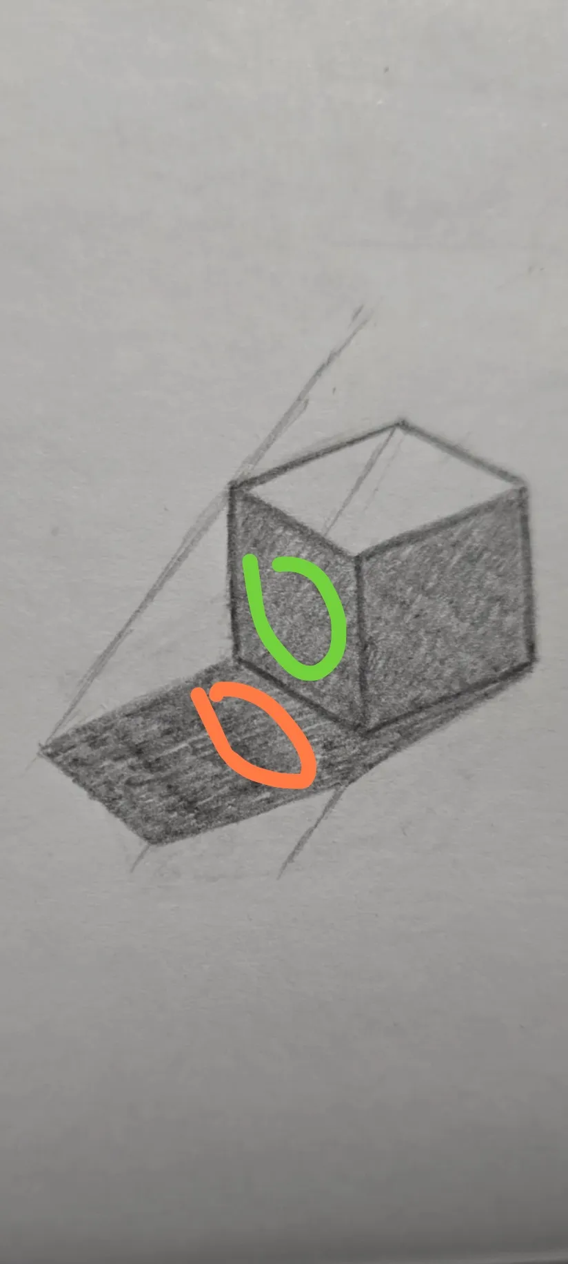 В область, отделённую пунктиром (я её отметил кружочками), так или иначе будет попадать свет, из-за дифракции, отражений и т.д. но вот там внутри треугольника будет тем глубже и темнее, чем сильнее мы будем отдаляться от рёбер куба