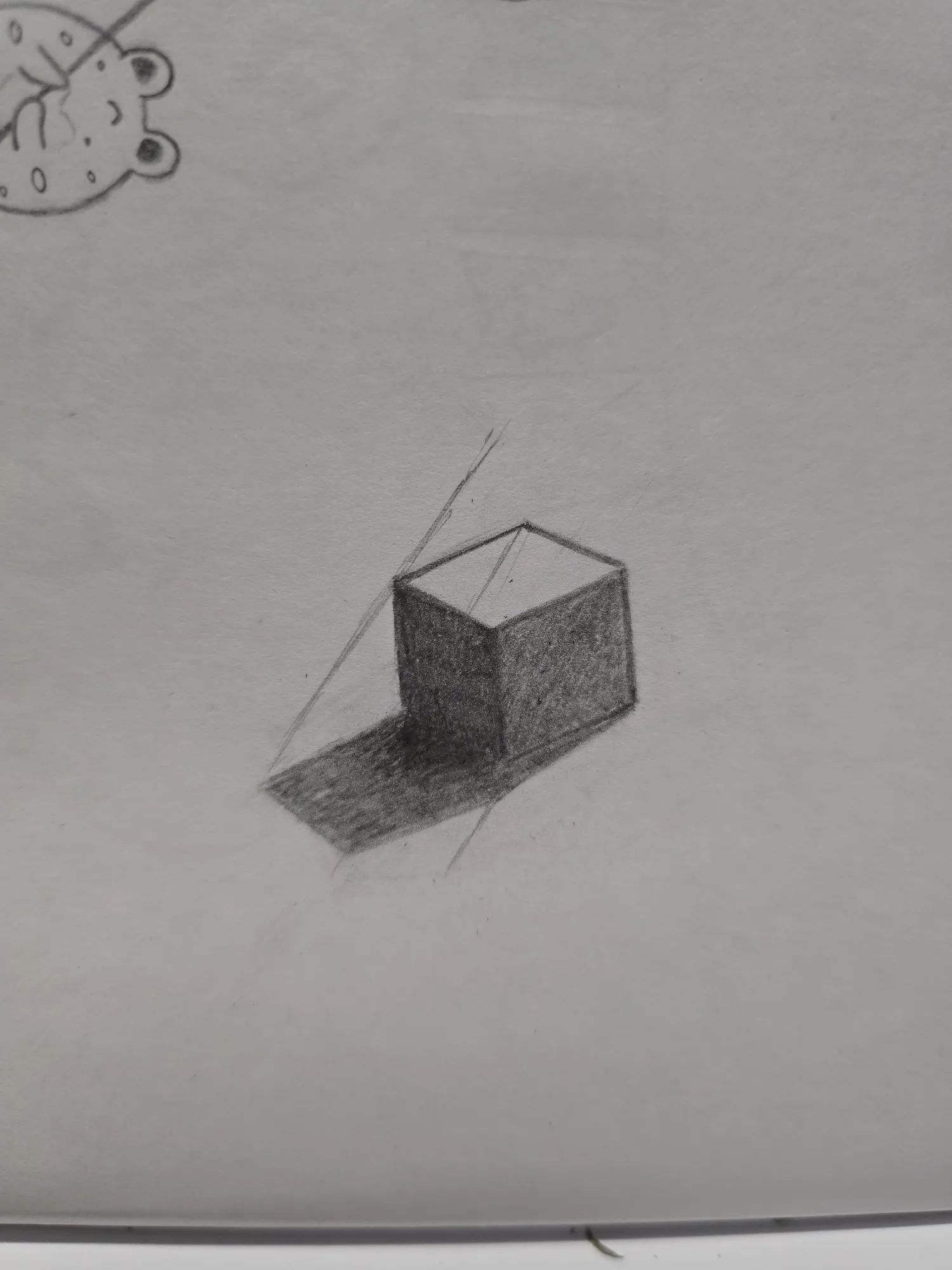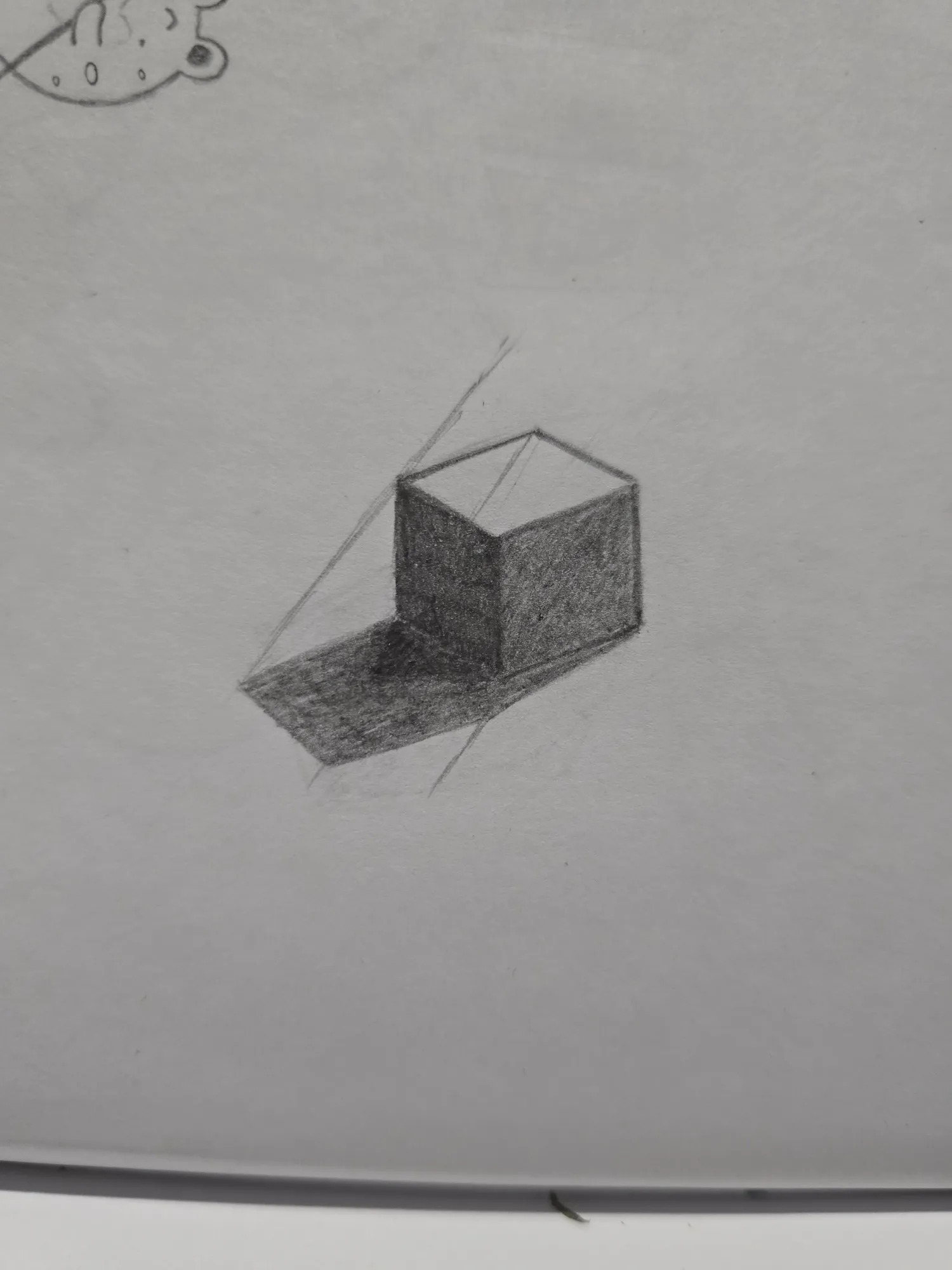 Из ошибок @Kukabara - на грани, что ближе к нам тень имеет градиент. Она так будет лежать только если эта сторона фигуры выпукла. В противном случае тень должна быть равномерной и только иметь акценты рефлексами в случае необходимости.