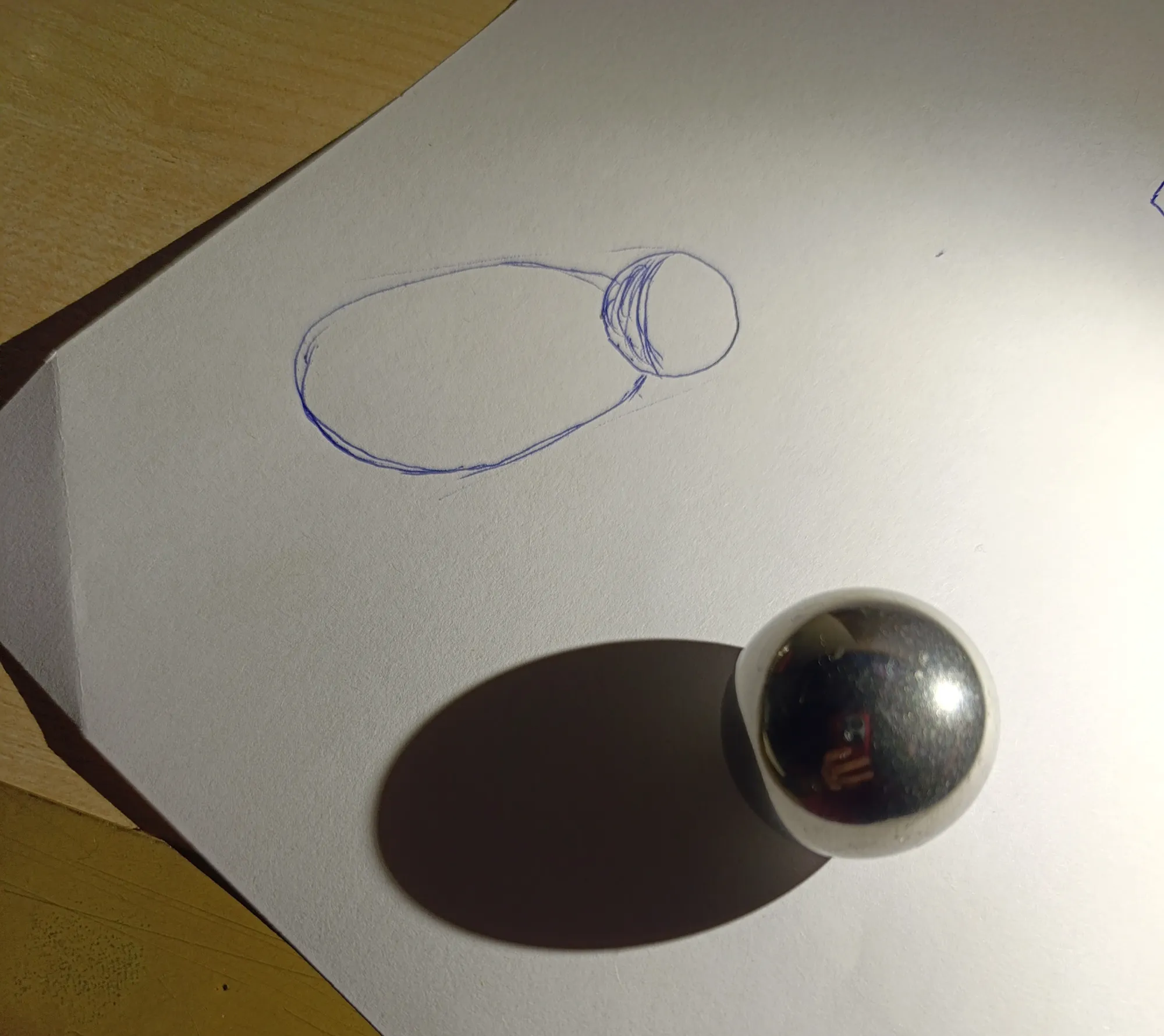 так. кстати, касаемо шарика)) а как будет выглядеть тень, если свет сверху? просто кругляшка тёмная под шаром? (я ещё не нашла шарик, чтоб лампой туда светить:D)