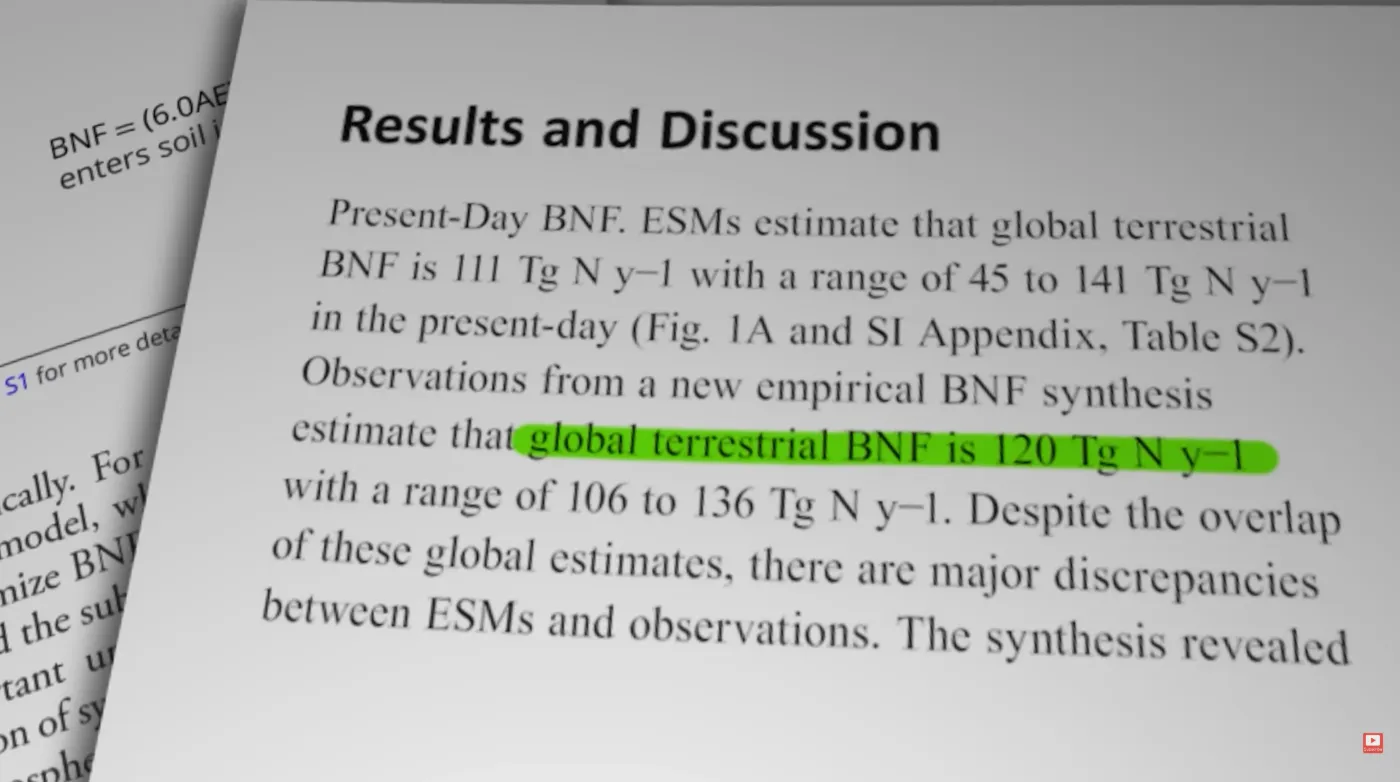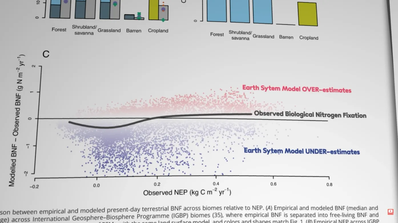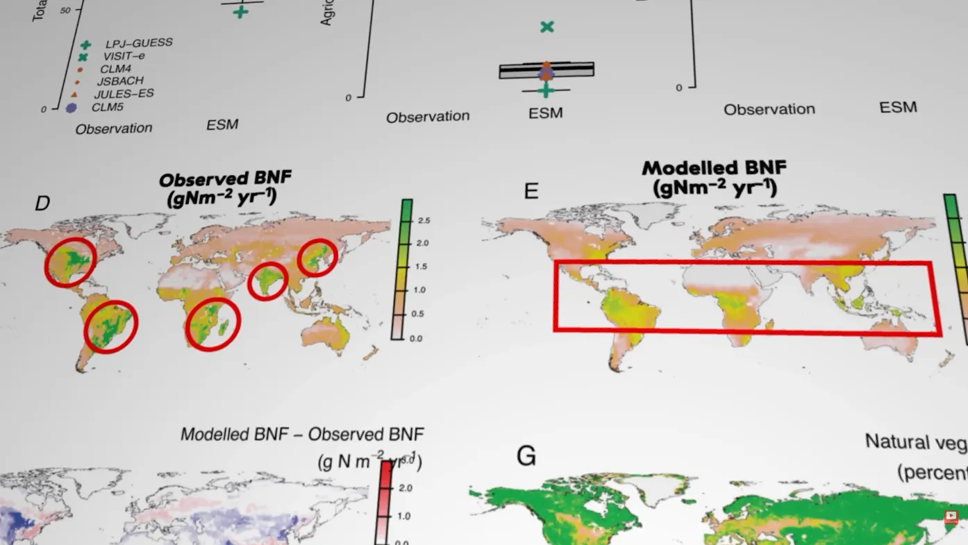 Шестой проект по сопряжённому моделированию климата (CMIP6) включает несколько десятков моделей земной системы от разных научных центров. Часть из них в явном виде учитывает азотный цикл – и именно в них кроется проблема, на которую указала группа Ку-Гизбрехт. Основой для сравнения послужил обширнейший эмпирический набор данных, опубликованный ранее в 2025 году в журнале Nature командой Карлы Рейс Эли: тысячи прямых измерений скоростей азотфиксации в лесах, саваннах, пустынях, пастбищах и на пашнях. Сводная картина, которую рисуют наблюдения, такова: суммарная глобальная азотфиксация составляет около 120 тераграмм (1,2 метрических тонн) азота в год. Из них примерно 65 Тг/год приходится на естественные экосистемы, ещё 56 Тг/год – на агроэкосистемы с их обширными посевами бобовых культур.