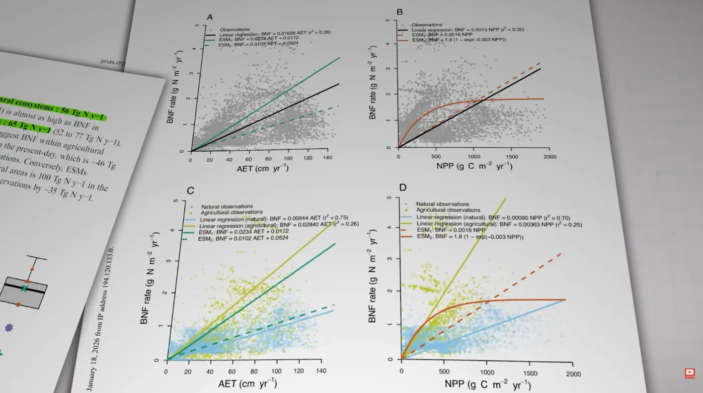 Откуда взялась методическая ошибка? Большинство моделей оценивают интенсивность азотфиксации через одну универсальную зависимость от первичной продукции и реальной эвапотранспирации. Наблюдения, однако, однозначно свидетельствуют: в природных и агроэкосистемах зависимость принципиально различна. В сельскохозяйственных угодьях – на американском Среднем Западе, в Бразилии, Восточной Африке, Южной и Юго-Восточной Азии – интенсивность азотфиксации с ростом продуктивности нарастает куда круче, чем в естественных биомах.