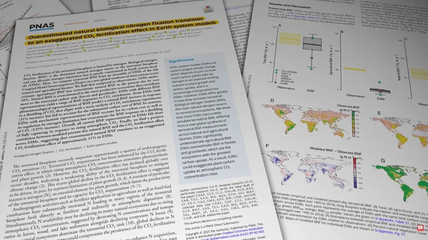 Команда под руководством Сиан Ку-Гизбрехт из Университета Саймона Фрейзера показала: модели земной системы – те самые, на которых основывается шестой доклад МГЭИК, – систематически завышали количество доступного растениям азота в природных экосистемах. Из-за этой ошибки отклик фотосинтеза на удвоение концентрации CO₂ оказывается в моделях преувеличенным примерно на 11%, а наземный поглотитель углерода – заметно слабее, чем считалось прежде.