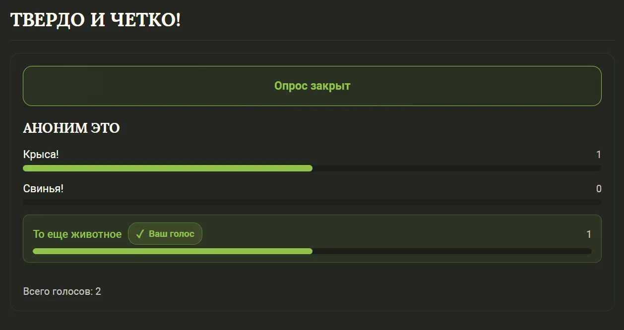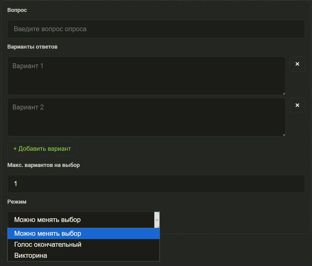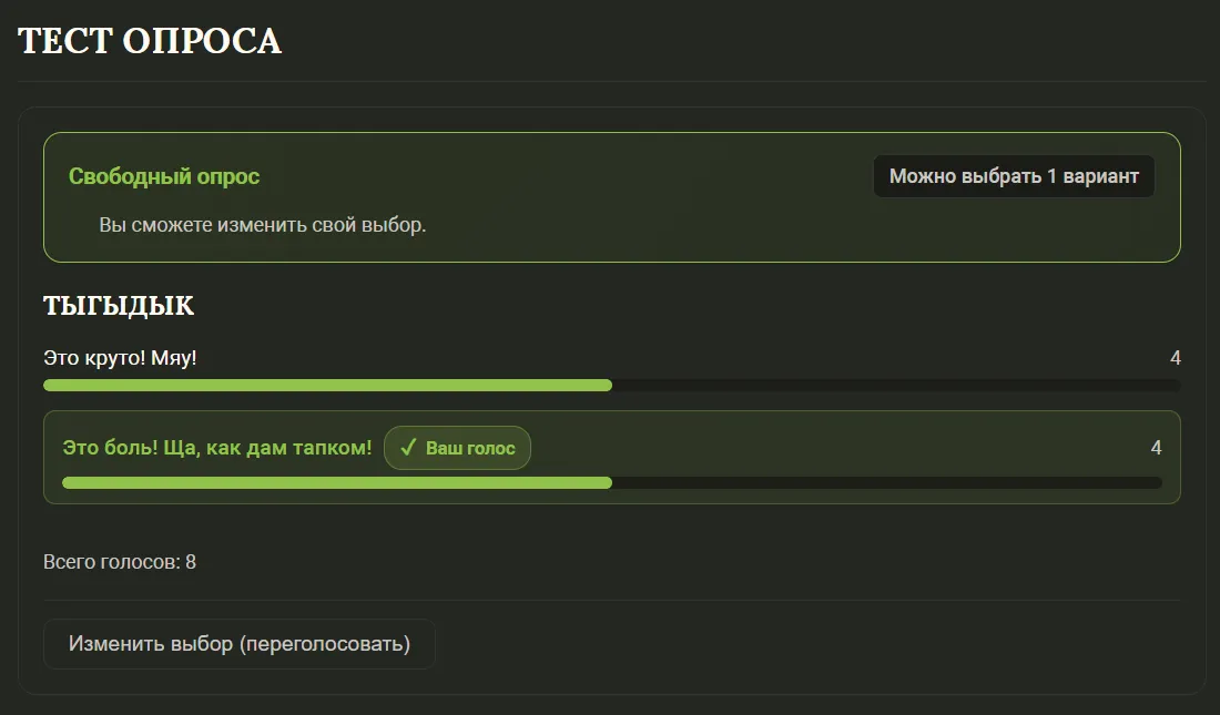 Свободный опрос позволяет изменить голос после выбора варианта и подходит для неформальных или любых других обсуждений.