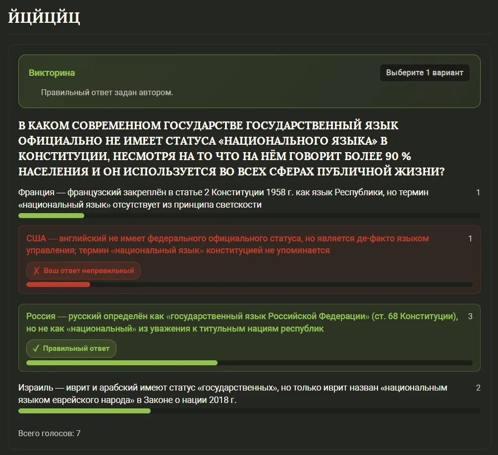Викторина даёт возможность указать правильный или неправильный ответ: после голосования пользователю показывается, верно ли он ответил.
