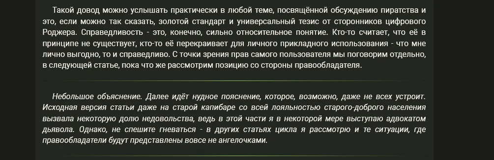 Ну и ещё пара моментов. Мне не нравится вёрстка текста в постах, особенно если это такие заметки, как у меня. У абзацев есть красная строка, но при этом текст не выровнен по ширине. Получается лично д...