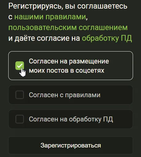 При регистрации теперь нужно подтвердить согласие на публикацию ваших постов в наших соцсетях.