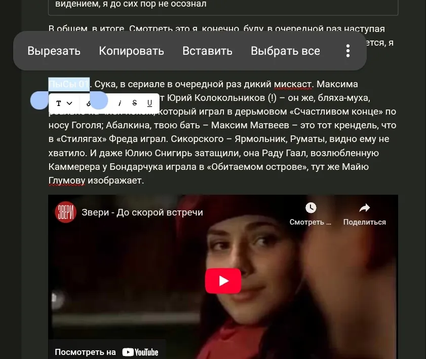 Второе. Меню с параметрами редактирования текста закрывается выделением, это очень неудобно. Некоторые параметры форматирования в этом случае недоступны, менюшка не перетаскивается, «прилипает» к выделению.