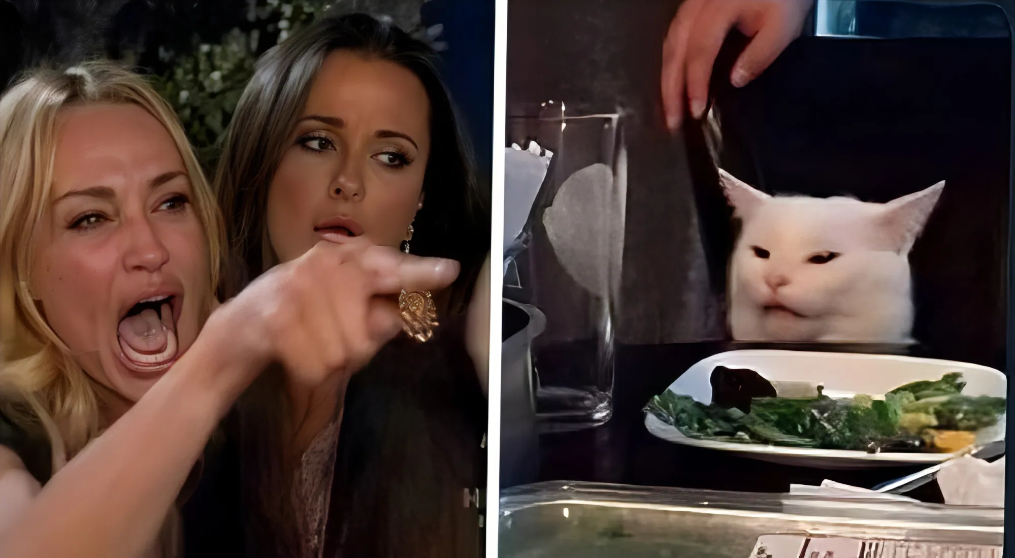 Картинка, ставшая популярной, впервые была опубликована 7 лет назад, в июне 2018 года. Называлась она «Он не любит овощи» (It doesn't like vegetables). Позже к ней в интернете присобачили двух женщин (одна из них истерично кричит что-то) из сериала «Настоящие домохозяйки из Беверли-Хиллз» (The Real Housewives, 2010, эпизод 14, сезон 2). Зовут котоморду в реальности Smudge (Клякса). У него есть свой аккаунт в инсте. Клякса, судя по всему, и правда ненавидит овощи, потому что есть не одна фотография, где он смотрит на них с отвращением. Проживает он со своими хозяевами в Оттаве (Канада).