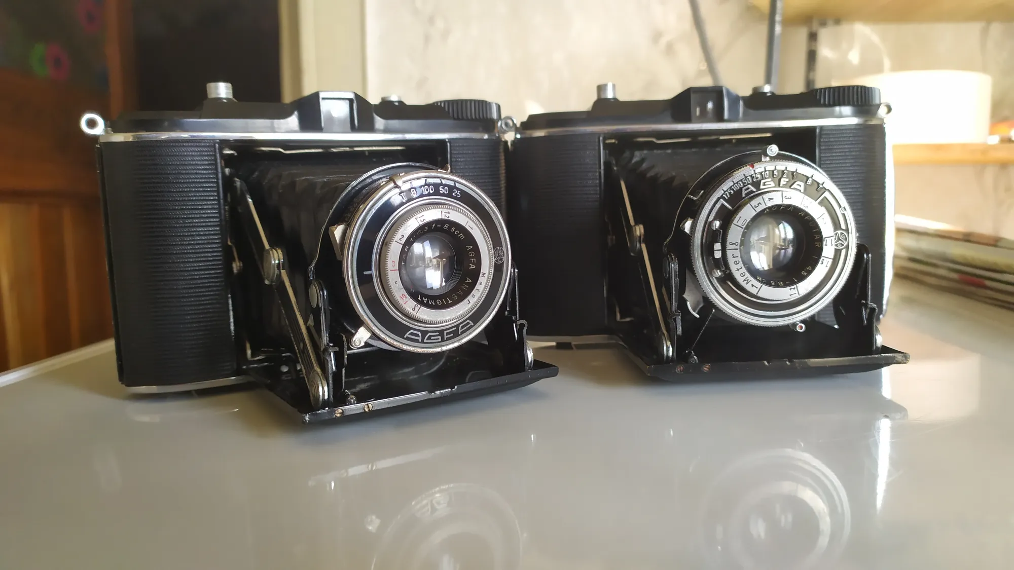 Две ранние Agfa Jsolette от 1937 года - промежуточная серия между самым первым выпуском, в котором модель ещё называлась Jsorette, и выпуском после реформы немецкой письменности, когда заглавную I перестали изображать как J (иными словами, на более поздних экземплярах написано Isolette).